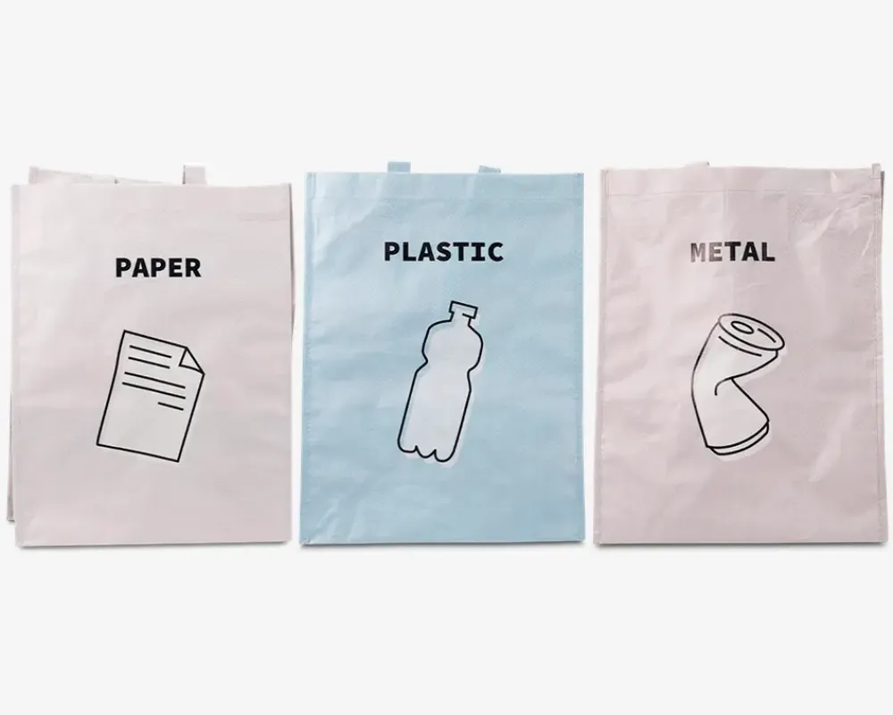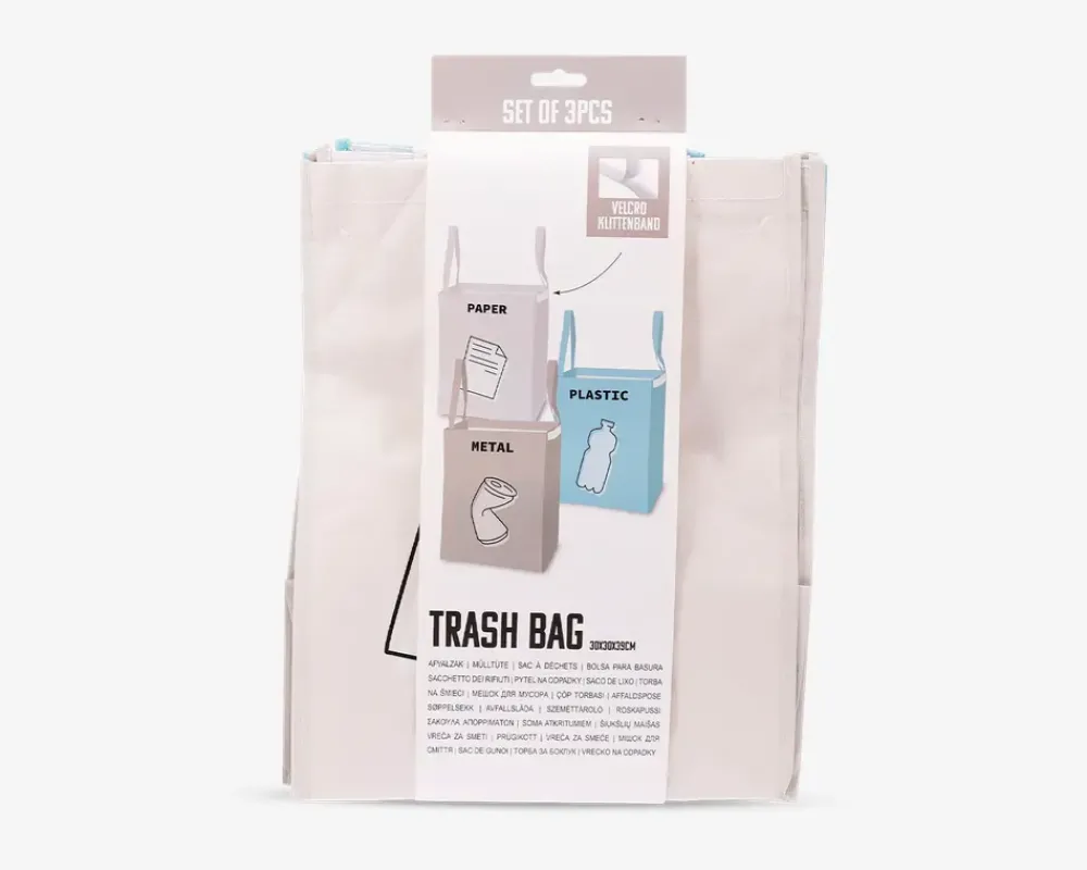 Affaldssorteringssæt med 3 poser, der er nemme at bære og tømme og samtidig kan de nemt foldes sammen. Poserne er til plastik, metal og papir og gør at affaldssorteringen bliver mere overskueligt.