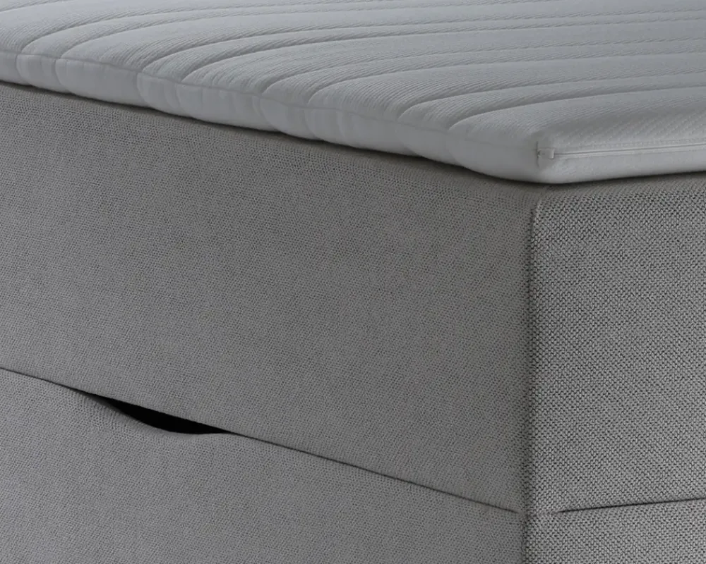 Denne boxmadras med magasin er beklædt med slidstærkt møbelstof i beige. Boxmadrassen er perfekt til både ungdomsværelset, studielejligheden og sommerhuset, den giver både en god soveplads, og masser af plads til opbevaring af ekstra dyner, tasker og lignende. Selve magasinet er monteret på en base fremstillet af lamineret spånplade, beklædt med slidstærkt møbelstof.Madrassen er monteret på basen med kraftige beslag, og løftefunktionen lettes af en gasfjeder som letter arbejdet med at åbne og lukke til magasinet. Bemærk de fine udskæringer i magasinet, som forhindre at du får fingrene i klemme, når du åbner og lukker.Selve madrassen består af et fjederindlæg bestående af 231 posefjedre pr. m². Posefjedre er individuelt indpakket, og giver derfor den bedst mulige støtte til din kroppen, igennem hele natten.Polstringen er en 25 kg. polyetherskum, som giver en behagelig komfort.Topmadrassen består af 30 mm profileret polyetherskum, beklædt med quiltet stof i 100% polyester. Betrækket på topmadrassen kan afmonteres og vaskes ved 40°.Denne boxmadras med magasin giver en ny mening til konceptet med at opbevarer ting under sengen, du har her mulighed for at opbevare dine ting, på en pæn og ryddelig måde.• Magasin base i lamineret spånplade• Boxmadras med 231 posefjedre pr. m².• Topmadras i profileret polyetherskum• Betræk på topmadras kan vaskes• Mål i cm.: H. 62 x B. 90 x L. 200• Sælges komplet inkl. ben og topmadras• Leveres samlet