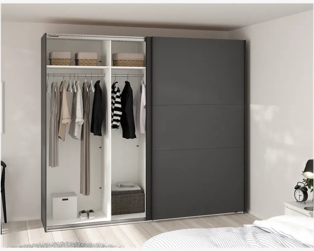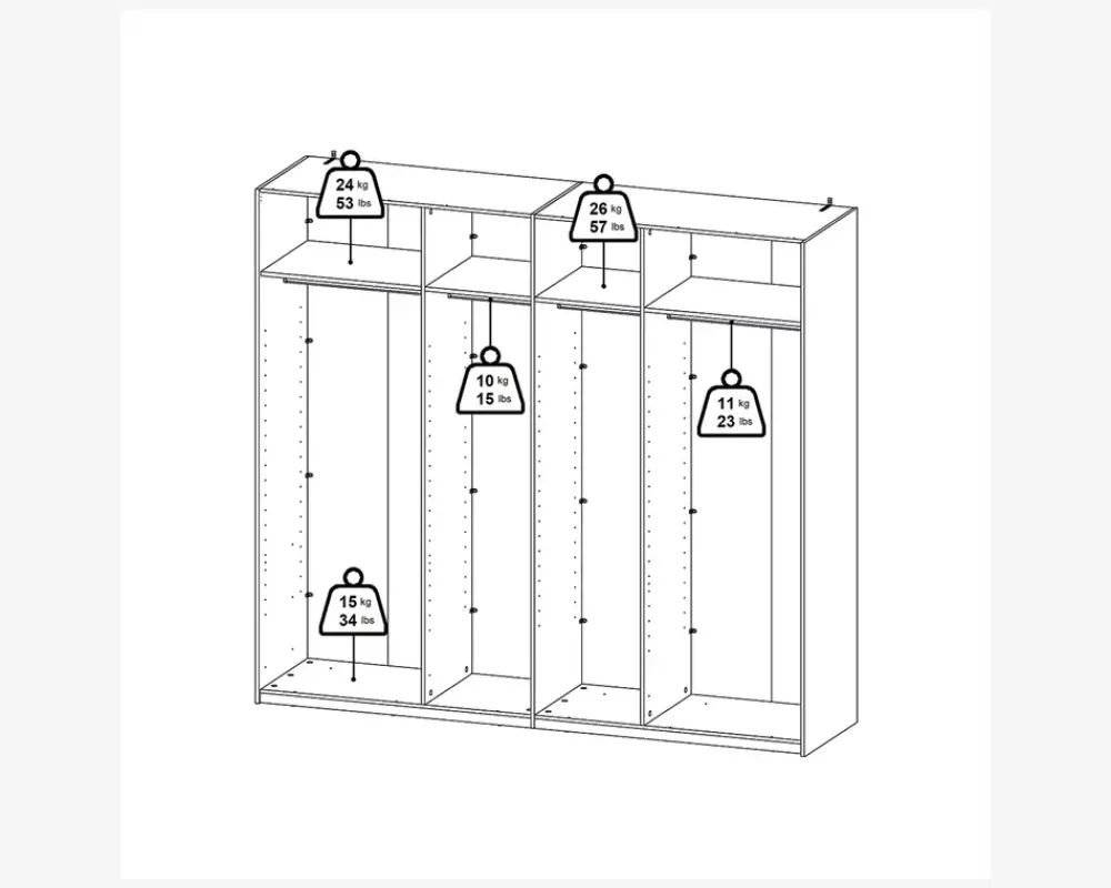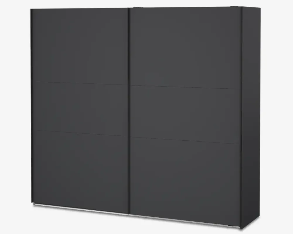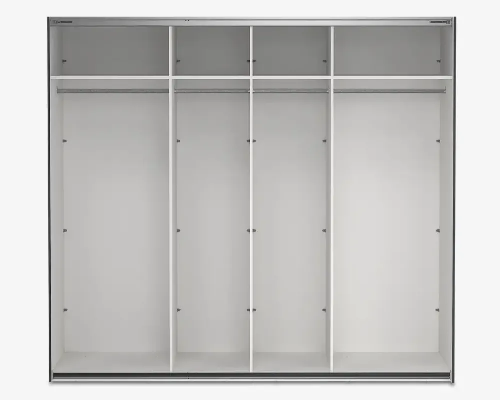 Her får du et virkelig rummeligt garderobeskab, som findes i flere bredder, så det er nemt at kombinerer, hvis du ønsker et stor garderobeskab, eller blot ønsker den samme type skab i hele huset. Dette garderobeskab måler H. 221 x B. 244 x D. 67 cm. Det indeholder fire rum, i hvert af disse er der en fast hylde, samt en bøjlestang. De to skydelåger leveres med dørdæmpere i denne størrelse de glider nemt og sikre en eksklusiv følelse når du åbner og lukker skabet.Der kan tilkøbes både ekstra hylder og skuffeindsatser, som vil give dig mulighed for at indrette skabet efter jeres behov. hvis du ønsker det kan den ene eller begge låger udskiftes til spejllåger, så kort sagt et skabsserie med mange muligheder.Skabsserien udmærker sig ved at den monteres oprejst, det giver bedre mulighed for at udnytte den totale lofthøjde i rummet, ligesom den kan samles på stedet, og ikke efterfølgende skal skubbes på plads, med risiko for skader på både møbel og gulvbelægning. Vi anbefaler at I er 2 når skabet skal samles. Garderobeskabet kræver ingen vedligeholdelse, og rengøringen foretages med en klud vredet op i rent vand.