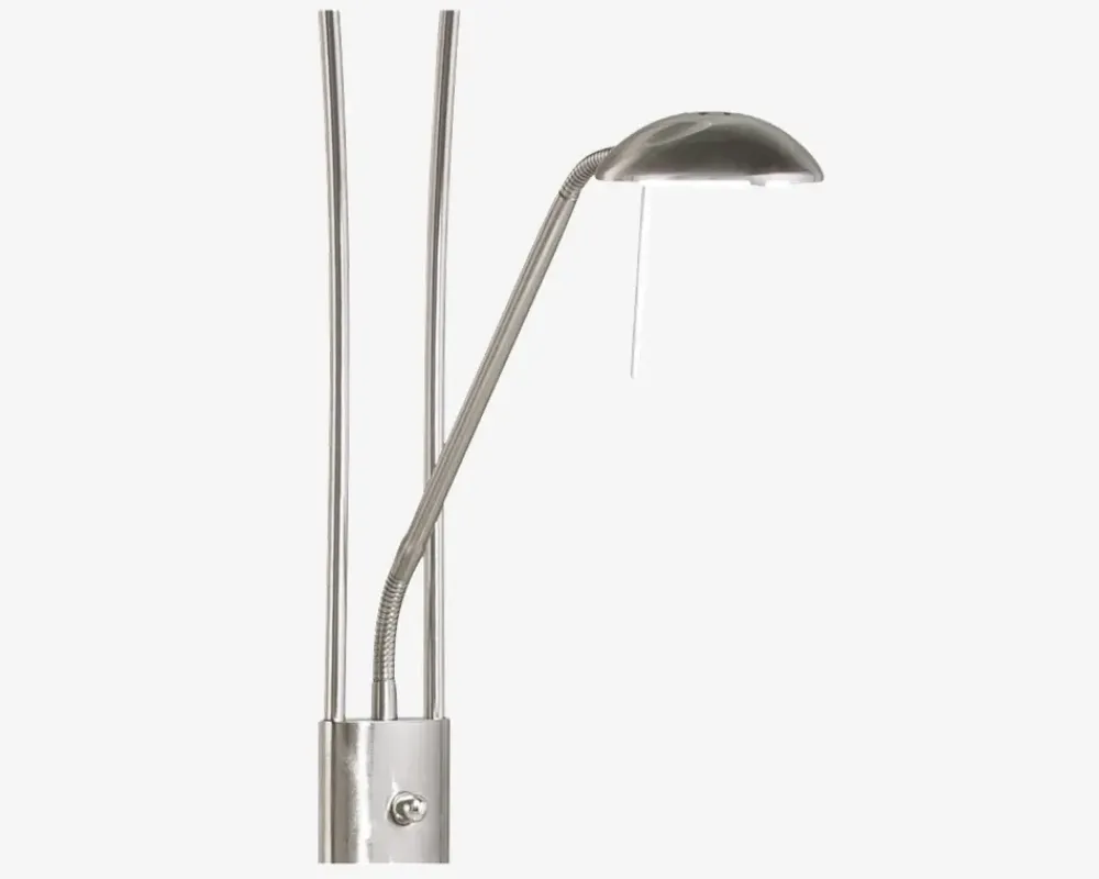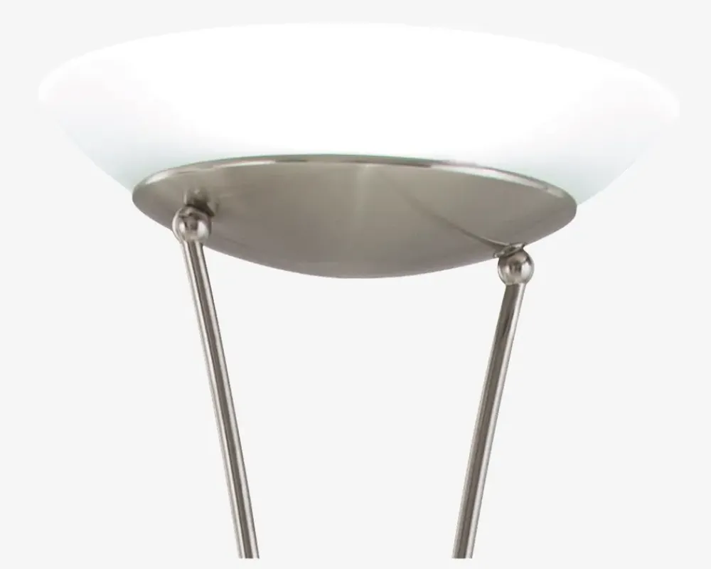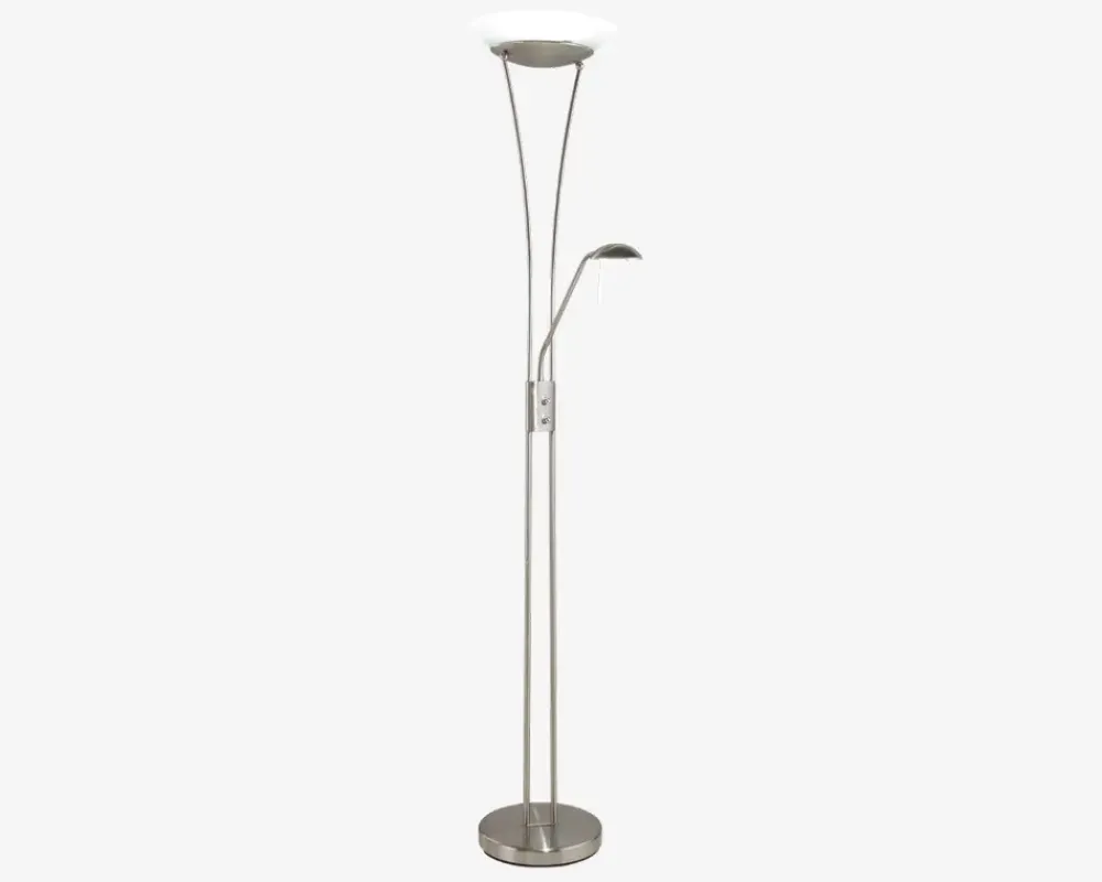 Praktisk standerlampe med opadgående lys, samt en bevægelig læselampe. Begge lamper er med integreret LED-dioder og har indbygget lysdæmper. Brug evt. lampen til læse- eller hyggebelysning i hele hjemmet efter behov.Lampen har en levetid på 20.000 timer og derfor er der mulighed for mange gange tænd og sluk.• Mål i cm: H.179 x B.32,2 x D.61• Farve: Krom/Opal• Materiale: Metal/Glas• Integreret LED, 18W og læsearm 4,5W• Dæmpbar• IP20• Lumen: 2500 og læsearm 400• Kelvin: 3000• Ledningslængde: 180cmBEMÆRK, at lyskilde ikke kan udskiftes