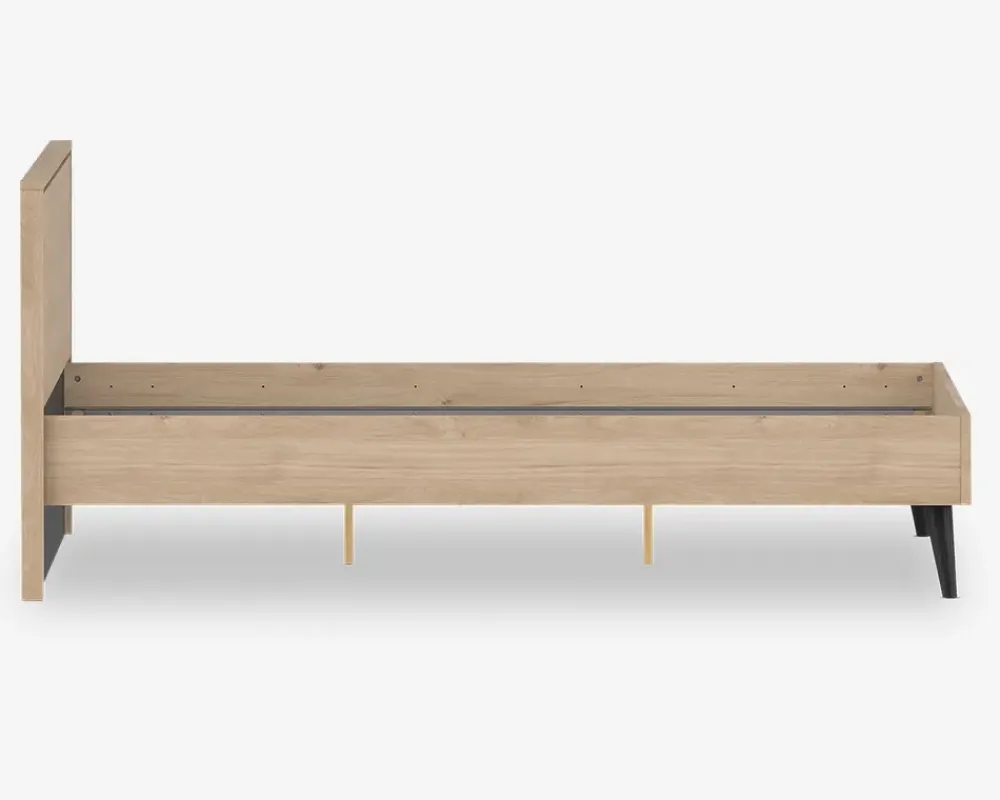 I den populære Ry serie til soveværelset, er der nu mulighed for at gennemfører indretningen så den passer sammen. Ry sengerammen er fremstillet i eg kunstfiner med sorte detaljer, og den passer perfekt sammen med kommoder, sengeborde og garderobeskab i samme serie. Sengerammen passer til et madras mål på B. 140 x L. 200 cm, og der kan både benyttes lamelbunde med springmadras, eller boxmadras. Sengerammen leveres usamlet, og vi anbefaler at I er 2 når sengerammen skal samles og flyttes. Sengerammen kræver ingen vedligeholdelse, og rengøringen foretages med en klud vredet op i rent vand.Hvis ikke du har bund og madras som du ønsker at genbruge, skal du huske at tilkøbe dette