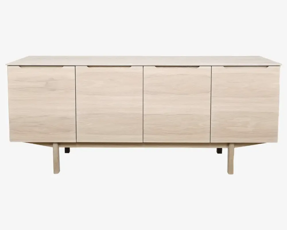 En skænk i meget høj kvalitet, produceret hos den danske møbelproducent Skovby Møbelfabrik. Skovby Møbelfabrik er kendt for at fremstille møbler i både klassiske og moderne design i meget høj kvalitet, til rimelige priser.Denne skænk er fremstillet i fineret olieret eg, skænken bør vedligeholdes med hvidolie med jævne mellemrum, hvor tit det skal ske er umuligt og sige, da det afhænger af hvor møblet er placeret i hjemmet. Hvis skænken er placeret direkte i sollys, eller på et meget varmt sted, vil du opleve at den skal behandles oftere, ind hvis den står længere inde i stuen, og ikke får direkte sollys. Hvis der skulle opstå en lille skade på møblet, kan du slibe med fint sandpapir, og derefter genbehandle møblet med hvidolie, så vil skænken stå som ny igen. Bemærk at naturtræ ændrer farve (tager patina) når det udsættes for lys, hvilket betyder at du kan være nødt til at slibe hele skænken ned, for at få samme farve på møblet, efter behandlingen.Skænken er inddelt i 3 rum, bag hver af de 2 døre til højre findes en indvendig skuffe med selvluk, samt en hylde, de 2 døre til venstre dækker over et stort rum med en hylde. Det giver dig mulighed for at opbevare selv store fade i skænken. Alle 4 døre er udstyret med softclose, som både giver en eksklusiv følelse, og samtidig er med til at skåne døren når den lukkes.• Fineret hvidoliere eg• 2 indvendige skuffer med selvluk• 2 smalle hylder• 1 bred hylde i dobbelt skabet• Softclose på alle 4 døre• Mål i cm.: H.79 x B.194 x D.41• Vægt: 70 kg• Leveres samlet, dog skal hylder og ben monteres