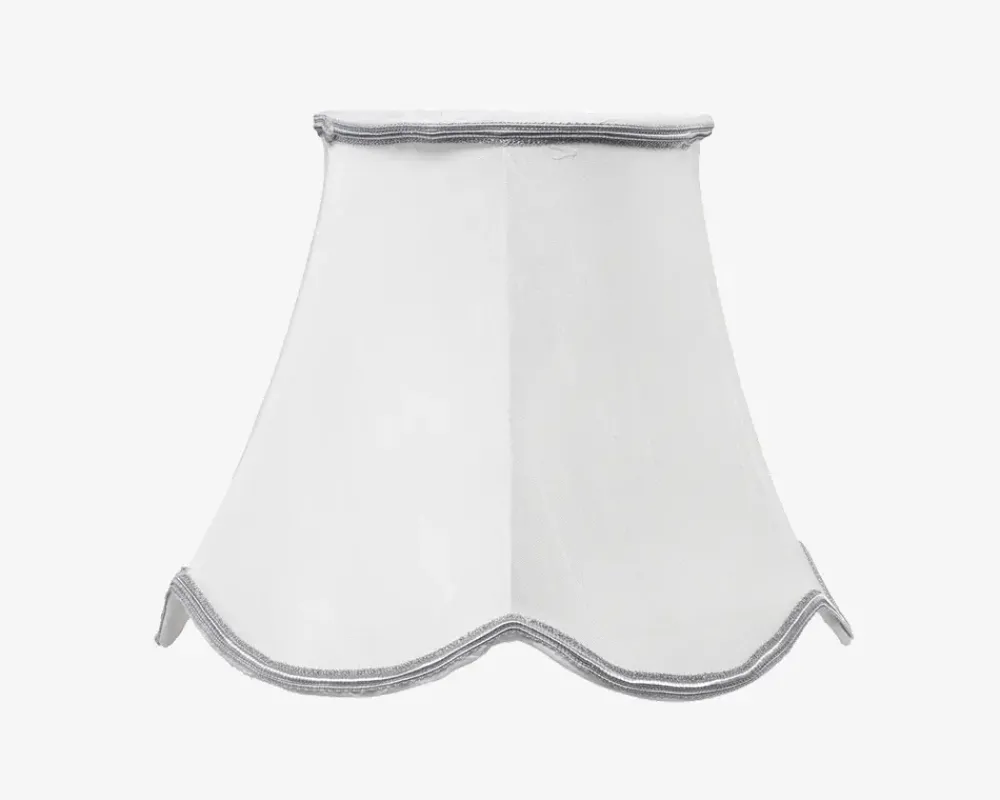 Charmerende Pagodeskærm i hvid med finde detaljer, da lampeskærmen har en sølvkant. Lampeskærmen afviger fra normale lampeskærme, da den er 6-kantet. Derudover er lampeskærmen med aftageligt låg, afhængigt af hvor meget lys man ønsker i det pågældende rum.