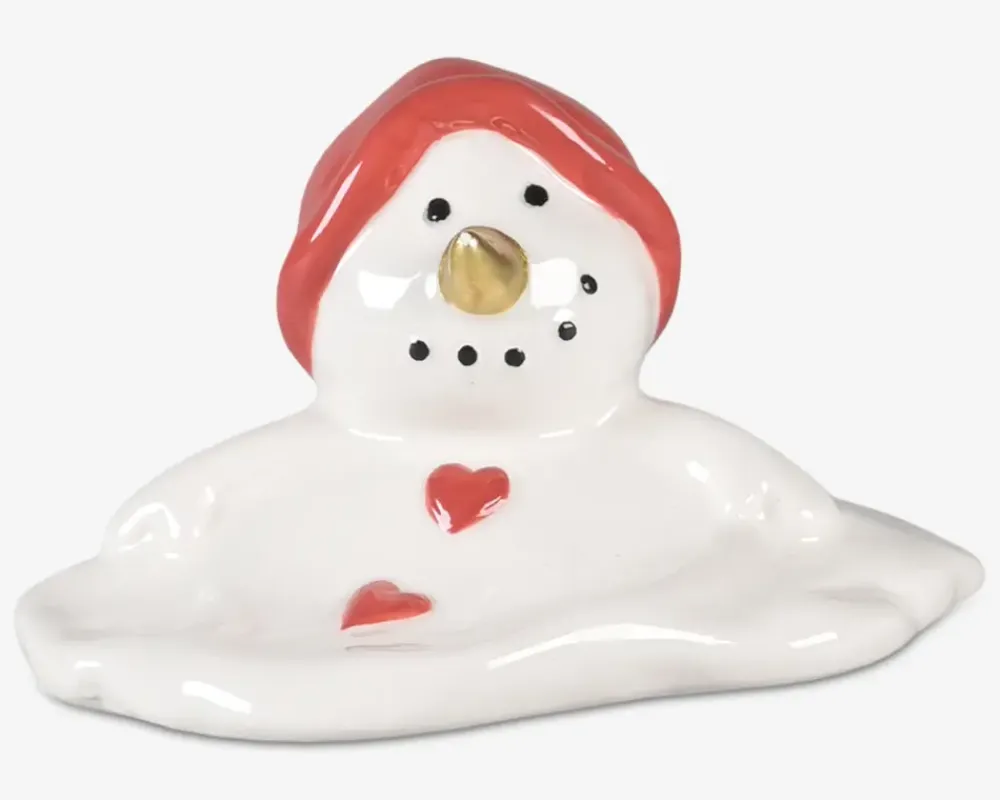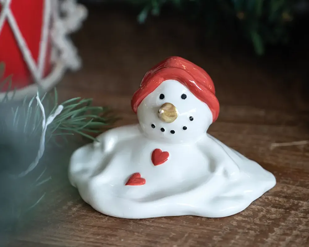 Dekorativ snemand i hvid med et smeltet udtryk, der giver et sjovt og anderledes twist til julepynten. Figuren har en højde på 5 cm og passer perfekt som en lille detalje på julebordet, i vindueskarmen eller som en del af en kreativ juleopstilling.