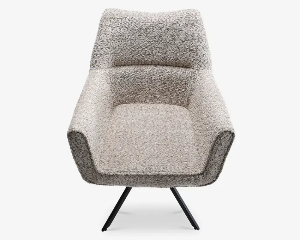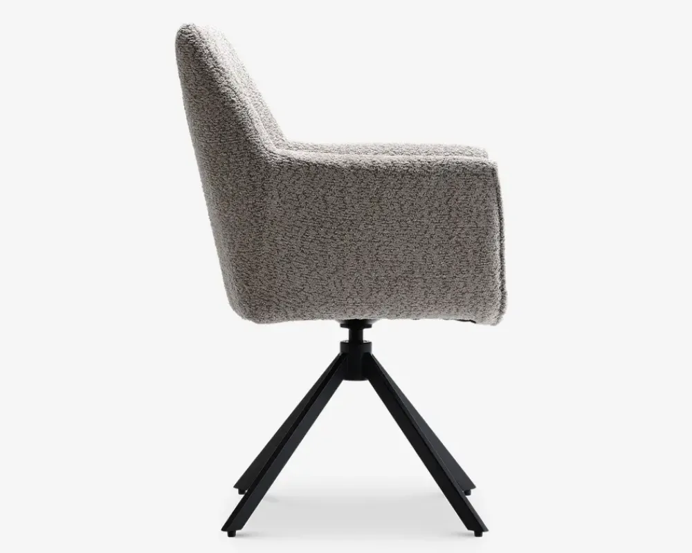 Flot designet spisebordsstol med armlæn, som er fremstillet i et flot moderne betræk, med sorte stålben. Stolen har 360° rotation, som gør det nemt at komme op fra stolen, det er dog vigtigt at du er opmærksom på det hvis du holder en tale og vil sætte dig ned igen. Stolen findes i 2 forskellige farver betræk beige og grå, så den vil passe ind i den moderne indretning. Stolen er bedst sammen med et spisebord der har en hvis størrelse, da armlænene gør stolen bred.Spisestuestolen kræver ingen vedligeholdelse, og rengøringen foretages med en klud vredet op i rent vand. Den sælges i pakker af 2 stk., og er nemt at samle det er kun stellet der skal monteres.