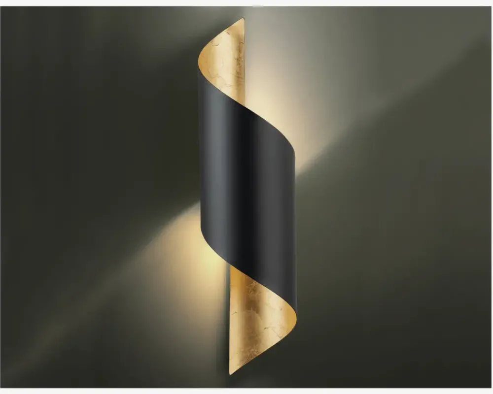 Smuk væglampe i sort metal med rustik guldfarvet indvendig belægning, som er med til at reflektere lyset flot ud af den snoet skærm. Jabaloyas er oplagt som belysning i entreen eller som sengelampe ved sengebordet.Kombinér evt. med andre lamper fra sortimentet og skab din helt egen personlige indretning.• Mål i cm.: H.63 x Ø.18,5 • Farve: Sort/Guld• Materiale: Metal• Fatningstype: E27 max 40W• Inkl. Lyskilde: Nej• IP-kode: IP20• Ekskl. ledning