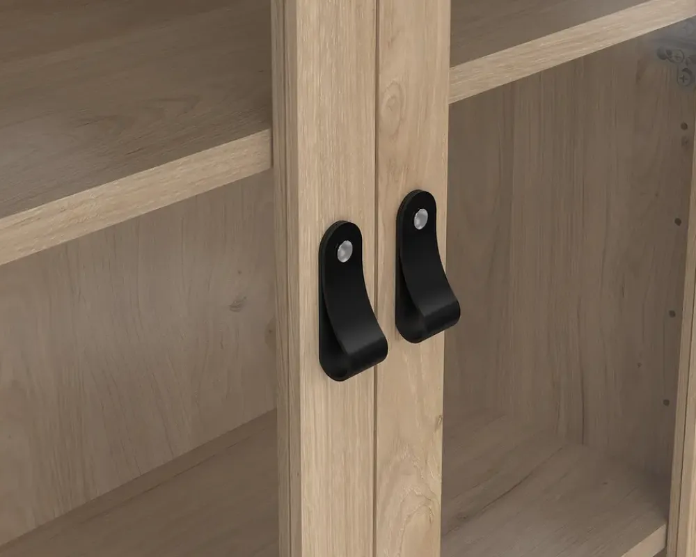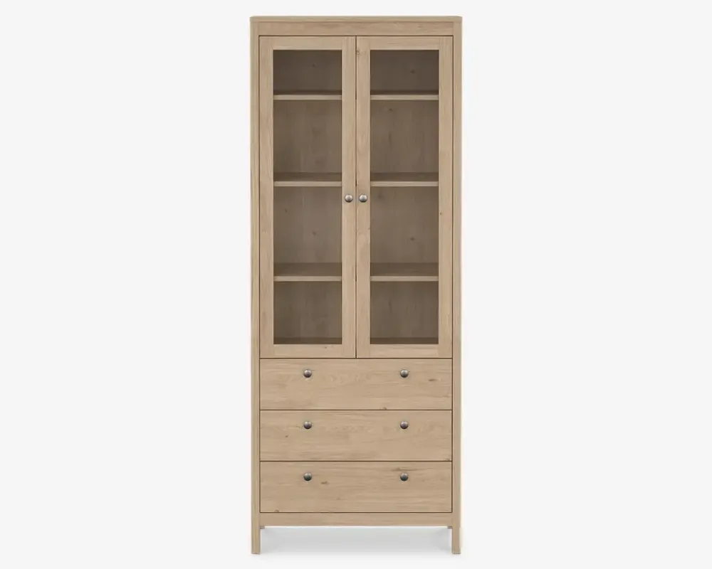 Vitrine i eg kunstfiner. Vitrinen har 2 glaslåger og 3 skuffer, og er fremstillet i country style, så den passer perfekt ind i det store landkøkken, men kan også sagtens bruges i stuen eller spisestuen. Bag dørene gemmer sig tre hylder. Du bestemmer selv udtrykket, vitrinen leveres med 2 slags greb, et i læder, samt en knop i antik stål. Vitrinen leveres usamlet, men hvis du følger den vedlagte samlevejledning, samles den uden problemer. Vi anbefaler altid at I er to om at flytte vitrinen på plads, så I undgår skader på gulvet eller møblet. Møblet aftørres med en klud vredet op i rent vand, og kræver ingen vedligeholdelse.