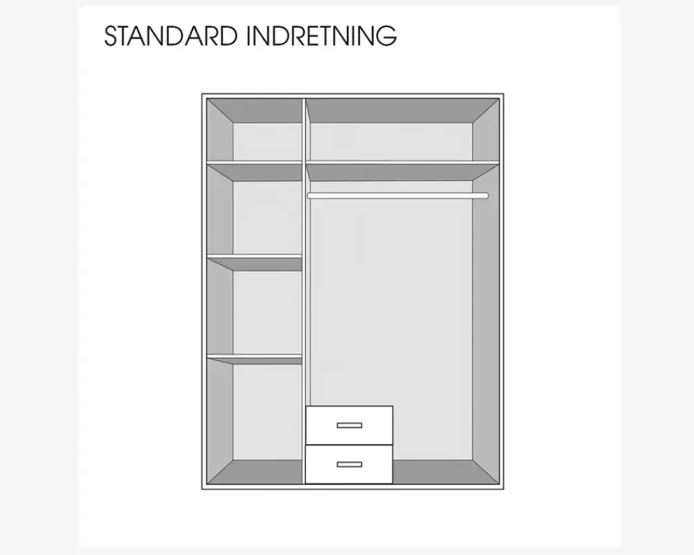 Garderobeskab som er perfekt til den lille lejlighed, børne- eller gæsteværelset. Skabet er fremstillet i eg kunstfiner, og leveres med to skuffer, to trædøre samt en spejldør. Garderobeskabet måler B.120 x H.195 x D.51 cm, og leveres usamlet. Garderobeskabet samles uden problemer, hvis du følger den vedlagte samlevejledning. Vi anbefaler altid at I er 2 om at samle skabet, så I undgår skader, både på produktet og på jer selv under samlingen. Vi anbefaler ligeledes at skabet fastmonteres i væggen, det vil både gøre skabet stabilt, og samtidig være en forebyggelse mod at skabet vælter, hvis der bliver kravlet op på skabets hylder.Skabet er færdigindrettet, og der kan ikke tilkøbes yderligere hylder. Bag de to døre til højre indeholder skabet en hylde samt en bøjlestang, og bag døren til venstre er skabet udstyret med 3 hylder, som kan justeres lidt i højden. Skabet giver med sin indretning plads både til bøjletøj kort og langt, tøj som du gerne vil have i skuffe, og endelig tøj som du ønsker at opbevare på hylder.• 4 hylder• 1 Bøjlestang• Mål i cm: H.195 x B.120 x D.51• Findes også i hvid kunstfiner• Leveres usamlet