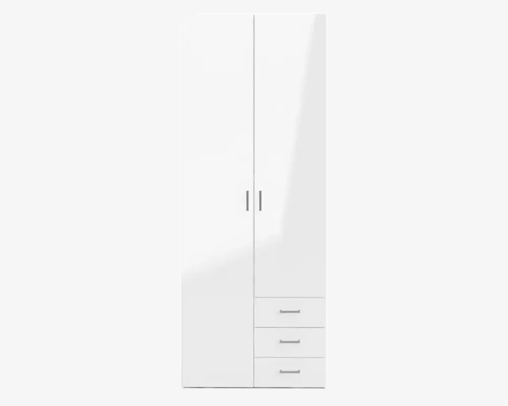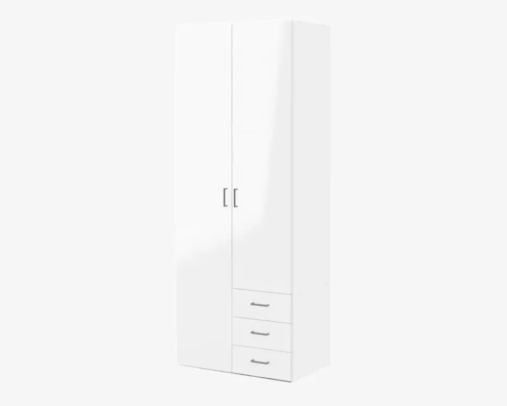 Space er en serie af garderobeskabe som findes i 3 størrelser. Space udmærker sig ved at være en serie af skabe i en fornuftig kvalitet, til en super god pris. Skabene leveres komplet med indretning, og der kan ikke tilkøbes ekstra hylder til skabene. Garderobeskabe er fremstillet i hvid kunstfiner med front i hvid højglans kunstfiner.Dette space skab er særligt velegnet til børne eller ungdomsværelset, men også i den lille lejlighed alle sommerhuset, hvor behovet for opbevaring af tøj er mindre. Skabet her måler 77,6 cm i bredden, og indeholder 2 rum som begge er 37 cm i bredden, i den ene side har du 3 skuffer, og bag lågen over skufferne er der som standard 3 hylder. Du bestemmer selv om du ønsker skufferne til højre eller venstre, du er dog nødt til at tage beslutningen før du samler skabet, da det ikke er muligt at ændre efterfølgende. I den høje del af skabet har du en hylde samt en bøjlestang, og det er ikke muligt at tilkøbe ekstra hylder. Skabet kan kombineres med de øvrige skabe i serien, hvis du har behov for mere skabsplads.• Produceret i Danmark• 4 hylder, 3 skuffer og 1 bøjlestang• Mål i cm: H.200,4 x B.77,6 x D.49,8• Leveres usamlet