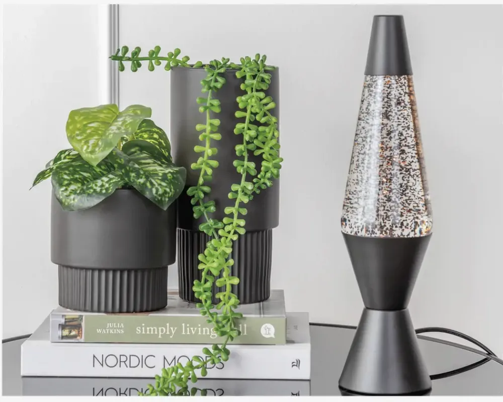 Denne lavalampe giver en varm og hyggelig belysning, samtidig med at den indeholder glimmer, der tilføjer en iøjnefaldende effekt. Lampen kan placeres flere steder i hjemmet og kommer i flere varianter. • Mål i cm: H.37 x Ø.10• Farve: sort • Materiale: metal• Lyskilde: 1 x R39 integreret, 25 watt • Ledningslængde i cm: 165