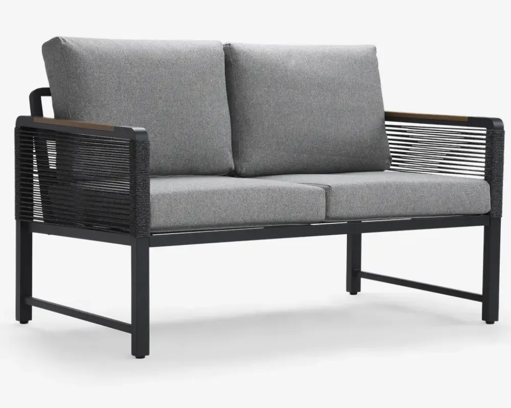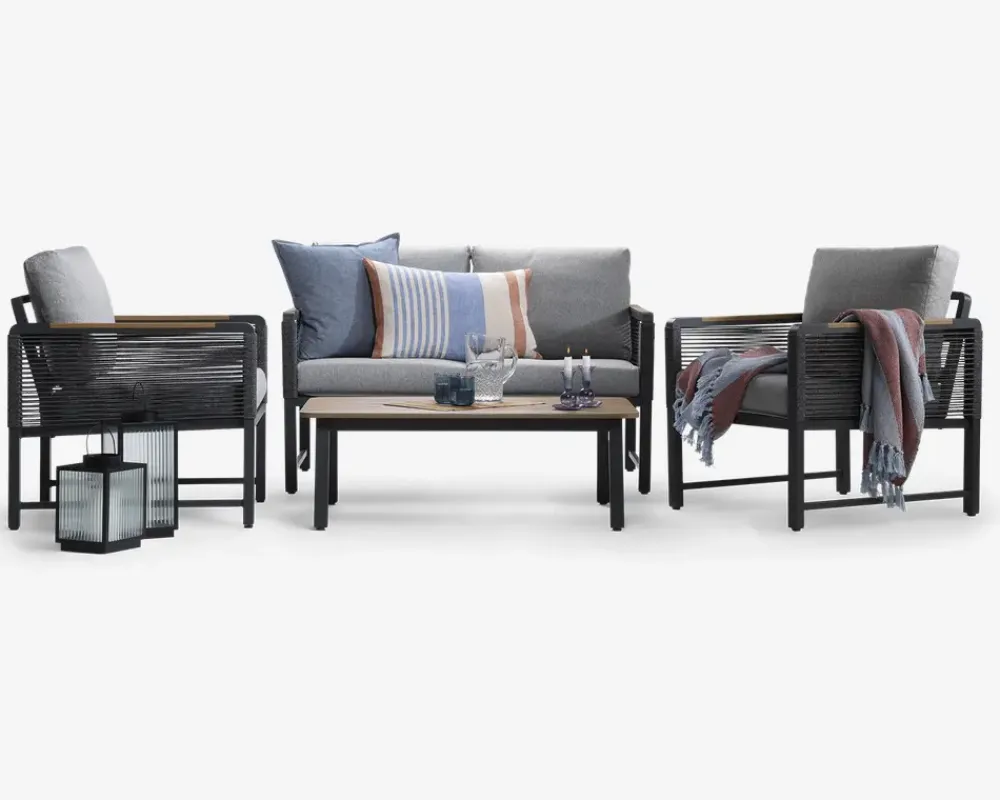 Flot og eksklusivt loungesæt med god siddekomfort til terrassen eller udestuen, hvor familien kan nyde de lange sommeraftener og solens stråler. Sættet består af en 2 pers sofa, 2 stole og 1 bord. Lounge sættet sælges kun komplet.Loungesættet er fremstillet med et stel i antracitfarvet aluminium og bordet har en bordplade med polywood. Loungesættet leveres inkl. alle hynder. Det anbefales at hynder ikke bliver udsat for regn. Sættet er vedligeholdelsesfrit og det eneste du skal gøre er, at vaske det i vand og sæbe. Loungesættet skal opbevares overdækket og tørt uden for sæsonen.• Sættet består af 1 sofa, 2 stole og 1 bord• Antracitfarvet alumunium• Inkl. grå hynder• Leveres usamlet, men samles nemt• Mål i cm på bord: B.59 x L.97 x H.34• Mål i cm på sofa: L.121 x D.70 x H.42/78• Mål i cm på stol: B.64 x D.70 x H.42/78