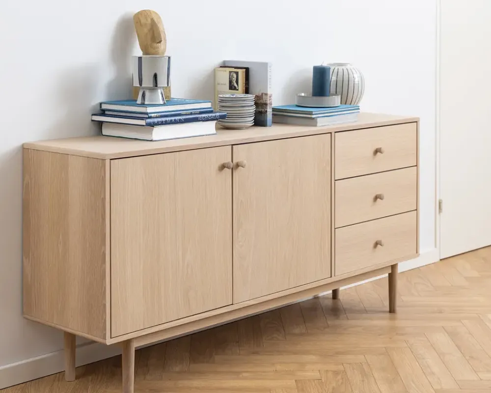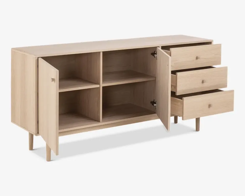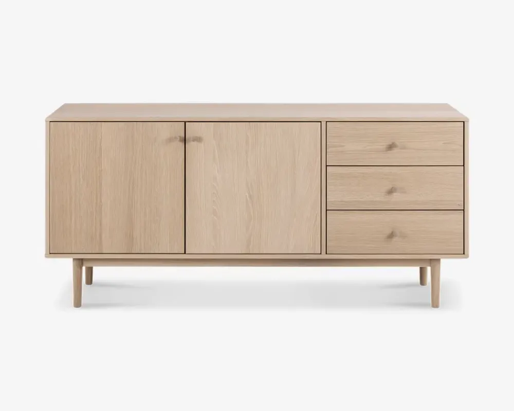 Flot skænk i skandinavisk design. Skænken er fremstillet i fineret og massiv hvidolieret eg. Skænken giver masser af opbevaringsplads, takket være de 2 låger og 3 skuffer. Bag hver låge finder du en hylde, som kan justeres lidt i højden. Både låger og skuffer er forsynet med soft-close.Skænken kræver en smule vedligeholdelse, vi anbefaler at du behandler skænken med hvidolie, når du har fået den leveret og samlet. Overfladen er oliebehandlet fra leverandøren, men for at sikre dig den bedste beskyttelse, anbefaler vi at du starter med at give bordet olie. Dette bliver især vigtigt, hvis du har vaser eller urtepotter placeret på toppladen. Rengøringen foretages med en klud vredet op i rent vand.Bemærk at eg er et natur materiale, som på virkes af direkte sollys, og tager patina. Derfor skal du være opmærksom på hvad der står på toppladen, og eventuelt flytte rundt på det en gang imellem. Rengøringen foretages med en klud vredet op i rent vand.Leveres usamlet