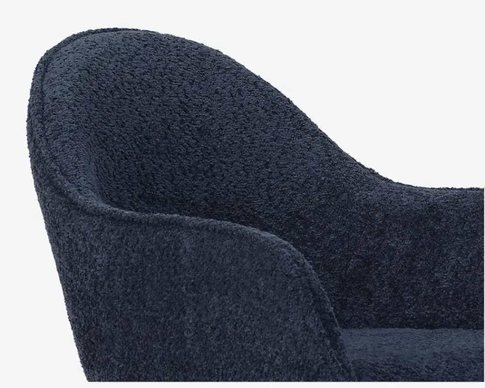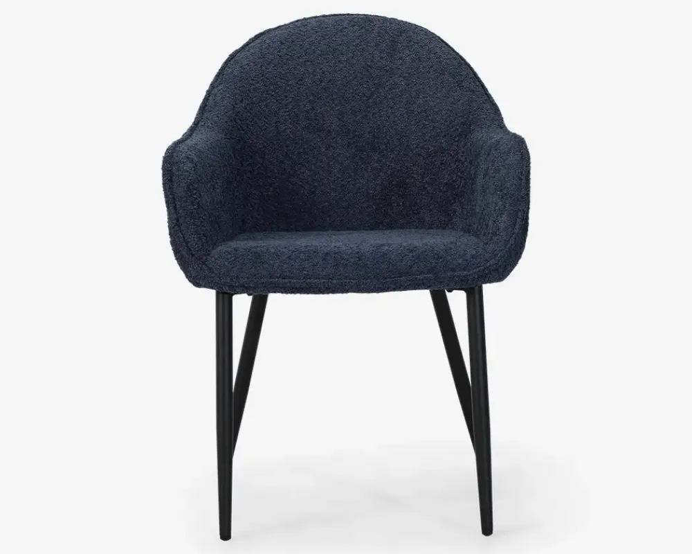 Dejlig lille spisestuestol med armlæn, i blåt bouclé stof med sorte ben. Selv om stolen ikke er stor, får du her glæden af en spisestol med god komfort, og ikke mindst fordelen med armlæn, som er super egnet hvis middagen bliver lang, eller i trænger til en spilleaften i familiens selskab. Stolene r med sit moderne design, og flotte stof et frisk pust til mange spiseborde, vi anbefaler stolen til borde af en hvis størrelse, der vil den tage sig flot ud.Stolen er fremstillet i blåt bouclé stof, som er nemt at holde, aftørring med en klud vredet op i rent vand, samt en gang støvsugning, vil holde stolen flot i mange år. Derudover kræver stolen ingen vedligeholdelse.Spisebordsstolen sælges i pakker af 2 stk.• Højde til overkant armlæn 64,5 cm