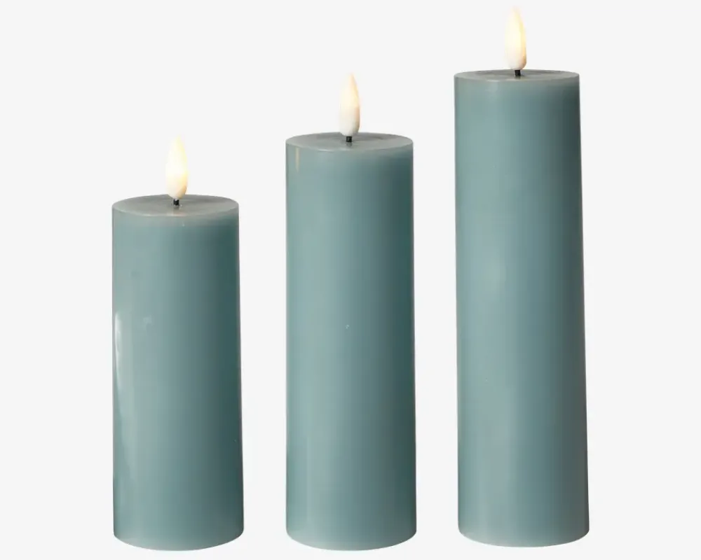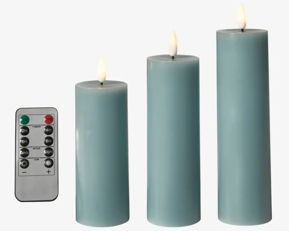 Dette LED-bloklys-sæt er det ideelle valg til at skabe en hyggelig stemning i dit hjem. Sættet indeholder tre LED-bloklys og en praktisk fjernbetjening, der giver dig fuld kontrol over belysningen. Hvert bloklys er designet til at efterligne ægte stearinlys og har en realistisk 3D-flamme, der skaber en varm og indbydende atmosfære. De blafrende flammer giver en beroligende effekt, og du kan nyde den hyggelige stemning uden bekymring for brandfare eller dryppende voks. Med den medfølgende fjernbetjening kan du nemt betjene bloklysene. Du kan tænde eller slukke dem, justere lysstyrken og endda vælge mellem forskellige lysfunktioner som blafrende eller kontinuerlig belysning. Det giver dig mulighed for at tilpasse belysningen efter dit behov og skabe den perfekte stemning.• Mål i cm: H.17,5/15/12,5 x Ø.5• Farve: Sea• Lys: Varm hvid• Batteri: 3xAAA pr. lys, ekskl.• Inkl. fjernbetjening, (Batteri 1xCR2025, inkl.)