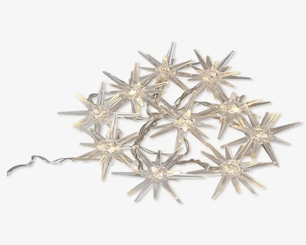 Lyskæde med 10 klare stjerner der skaber en hyggelig stemning. Bruger batterier og har timer. Husk derfor at tilkøbe 2 x AAA batterier.