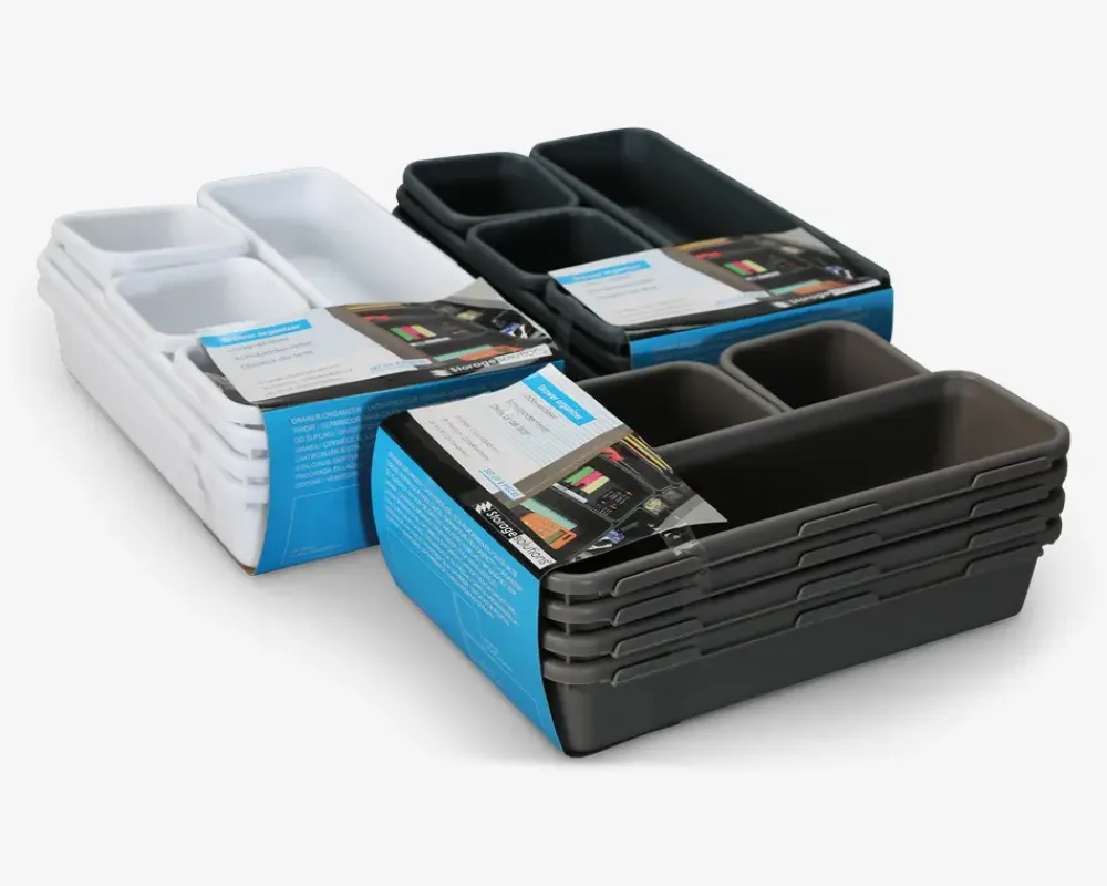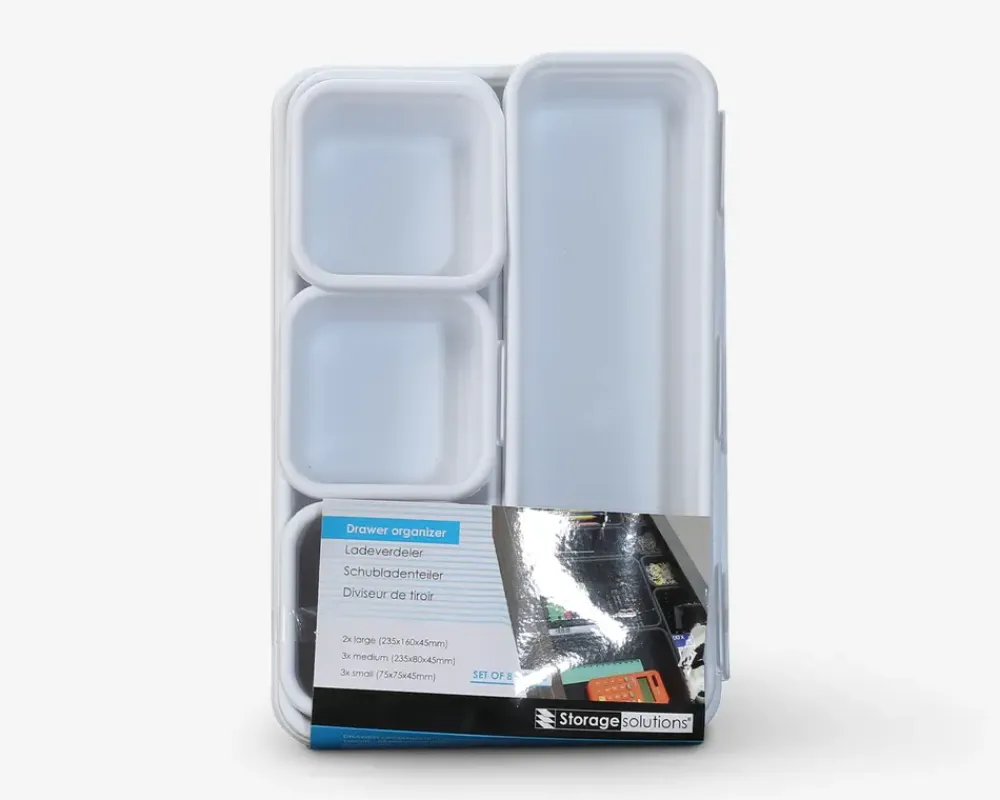 Skuffeindsats, der er praktisk, da den hjælper med at skabe overblik i skufferne. Dermed kan du organisere skuffen, så den passer til dine behov og holder orden i køkkenet, kontoret eller andre rum i hjemmet. Bemærk, at der ikke kan vælges farve ved køb i webshoppen.Pakken indeholder følgende størrelser: 2 stk. af 23,5x16x4,5 cm 3 stk. af 23,5x8x4,5 cm 3 stk. af 7,5×7,5×4,5 cm