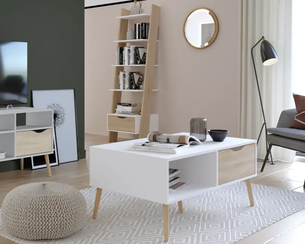 Elegant og flot retro inspireret sofabord med en stor gennemgående skuffe. Sofabordet er fremstillet i hvid med en lys eg kunstfiner på fronten. Med massive træben. Leveres usamlet, men samles let.Sofabordet er en del af en stor serie af møbler, som har et moderne og smart udtryk, serien er fremstillet i rengøringsvenlige materialer, og kan både som enkelt møbel og som serie stå som et frisk pust til indretningen. Se hele det store udvalg af Delta møbler her eller i en af vores møbelhuse.• Let og elegant design• 1 stor gennemgående skuffe• Rengøringsvenlige materialer• Massive træben• Leveres usamlet, men samles let• Mål i cm: L.99 x B.60 x H.44