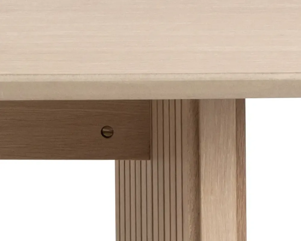 Her har du et flot stort spisebord, som kræver en del plads, men samtidig giver 8 spisepladser til hverdagen. Bordet vil passe flot ind i mange køkkenalrum og spisestuer. Bordet er rektangulært og måler B. 105 x L. 220, og lamelbenene gør designet let og moderne.Spisebordet er fremstillet i hvidolieret fineret eg, og det er vigtigt at oliebehandlingen vedligeholdes, for at holde overfladen pæn, og uden mærker. Dette bør gøres en til to gange om året. Rengøringen foretages med en klud vredet op i rent vand, husk at tørre efter med en tør klud. Bordet leveres usamlet, og grundet vægten anbefaler vi at I er to når bordet skal samles, og flyttes på plads. Træk aldrig i bordet, i skal være 2 når det skal flyttes.