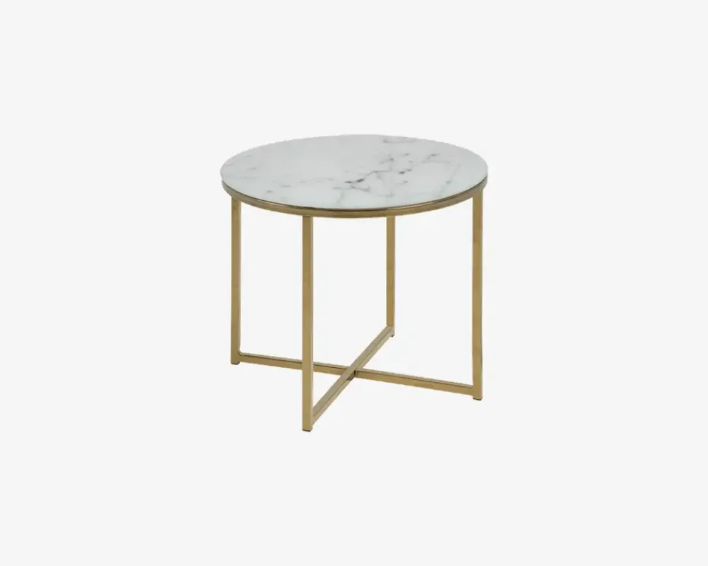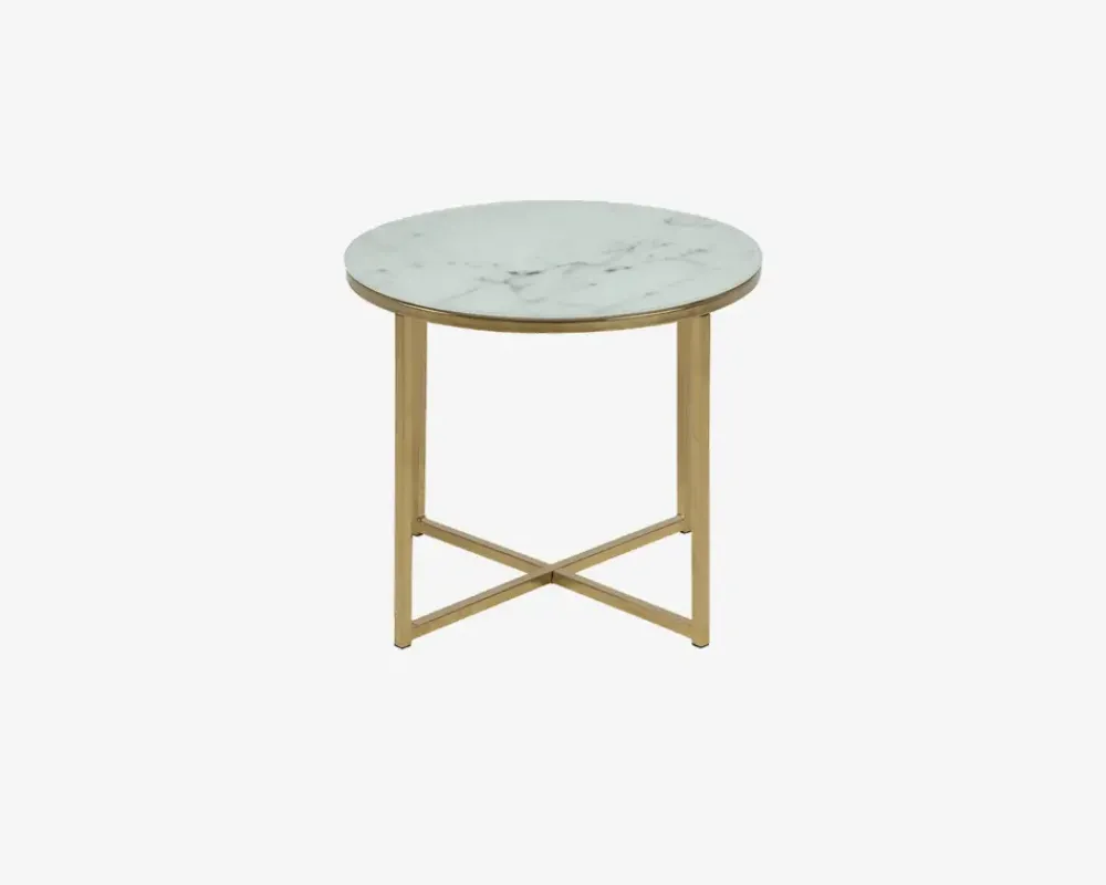 Elegant og moderne sofabord med glasplade som har marmortryk, så det ligner en marmoroverflade. Det har den fordel at bordet ikke er så tungt som et bord med marmorplade men er ligeså modstandsdygtig overfor ridser, varme ting osv. Bordet har et metalstel med messing farve som lige nu er noget af det mest ”hotte”. Det findes i et par forskellige udgaver. Her vist som sofabord i rundt, i 50 cm i diameter. Bordet leveres usamlet, men samles nemt.• Elegant og moderne sofabord• Glasplade med marmorprint• Messing farvet metalstel• Leveres usamlet, men samles nemt• Mål i cm. Dia.50 x H.42