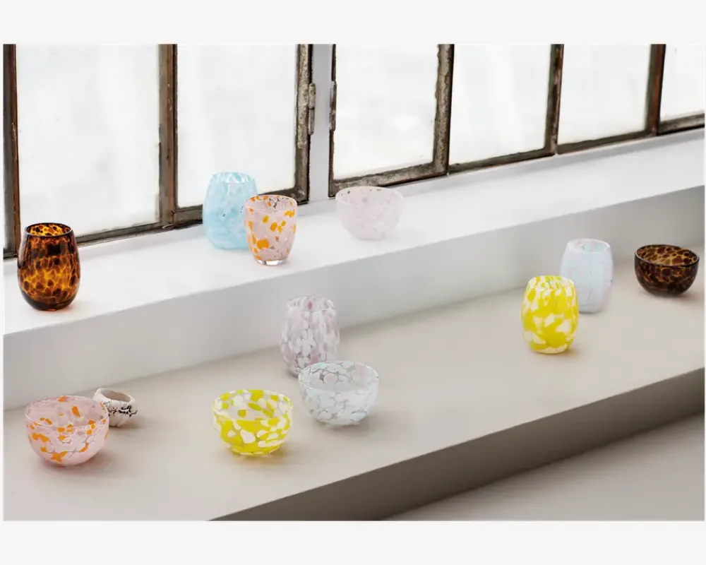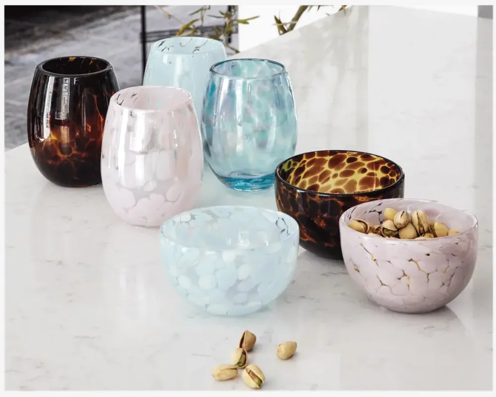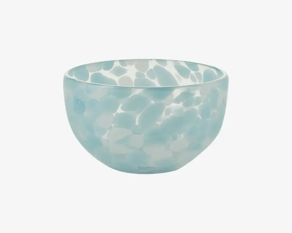 Skål i mundblæst glas med mønster i lyse blå nuancer. Skålen er en del af en serie som fremstilles i forskellige farver, ligesom der findes drikkeglas i serien. Skålen kan både bruges til morgenmad eller snacks, eller som indretning i hjemmet.Skålen tåler opvaskemaskine.• Mål i cm. : H.4,5 x Ø.11,5• Materiale: Glas• Farve: Lys blå•Kan vaskes i opvaskemaskinen
