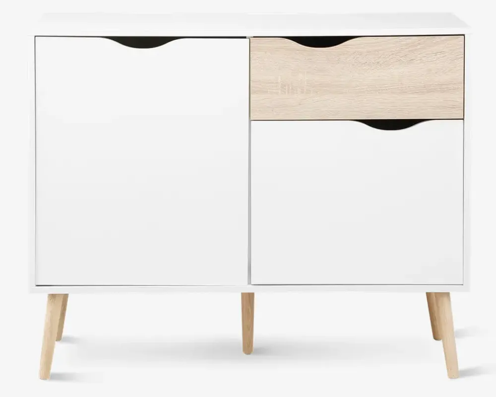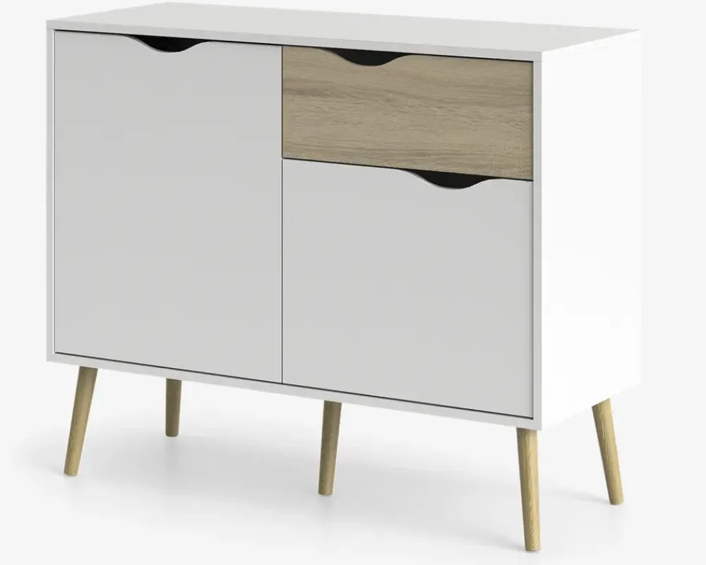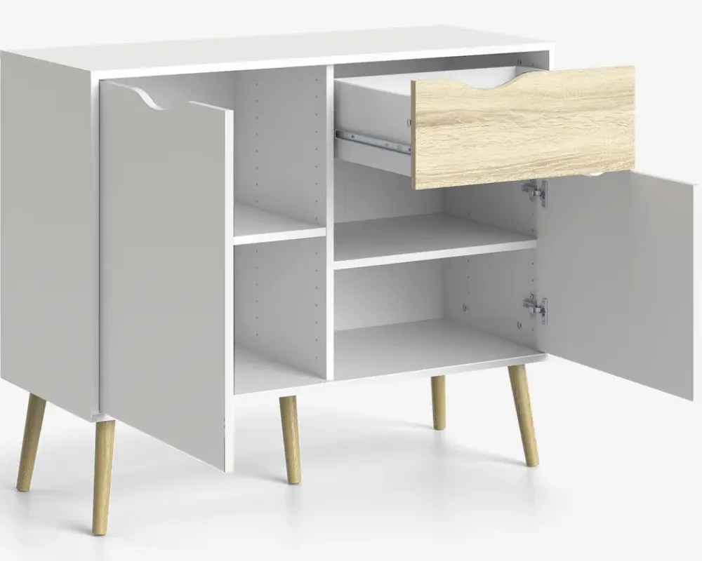 Denne smarte lille skænk i hvid/eg kunstfiner giver god opbevaringsplads trods sin lille størrelse og vil kunne passe ind i enten spisestuen eller køkkenet. Farve kombinationen passer perfekt sammen med en masse forskellige spiseborde og stole, og det lette skandinaviske design, vil passe flot ind i mange hjem. Materialerne sikre dig et møbel, som er nemt at rengøre og vedligeholde, kunstfiner tåler alle former for rengøringsmidler, undtaget rengøringsmidler med slibemidler i.Skænken har 2 døre, bag den ene er der en løs hylde, samt 1 skuffe. Skænken er nem at samle, og du vil opleve en kvalitet som du kan have glæde af i mange år fremover.• 2 døre og 1 skuffe• Let og elegant design• Rengøringsvenlige materialer• Mål i cm.: H82 x B.99 x D.40• Leveres usamlet, men samles nemt