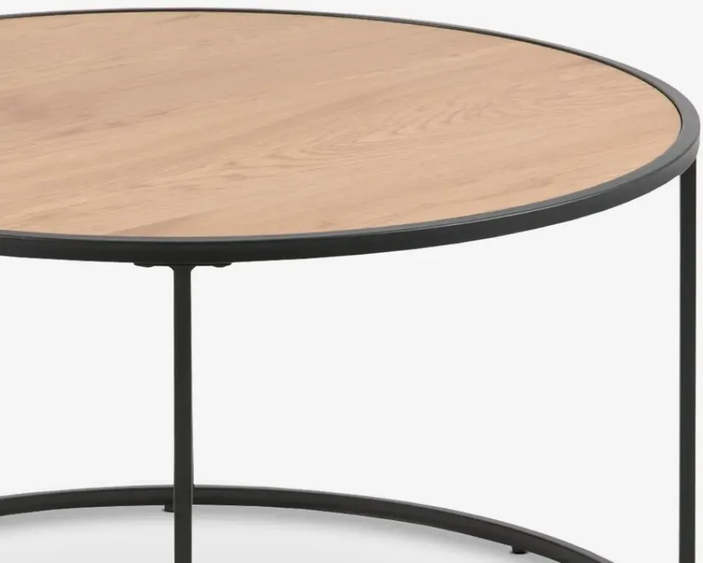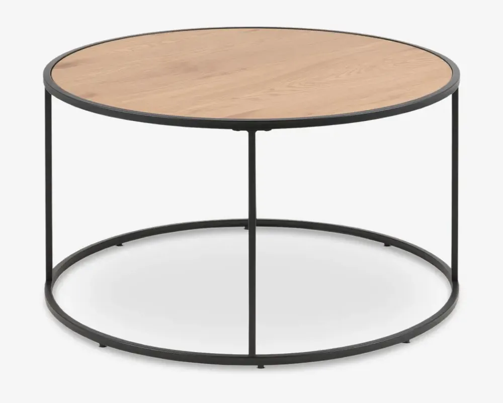 Smart, let og elegant sofabord med en bordplade i vild eg kunstfiner, med sortlakeret metalstel. Passer rigtig godt de fleste steder uanset stil og farvevalg. Bordet har en stærk overflade som er meget rengøringsvenlig. Sofabordet leveres usamlet, men samles nemt.I denne serie kan der fås mange forskellige møbler, som gør det muligt at møblere de fleste rum i hjemmet med lige netop denne serie. Serien består af meget ”lette” møbler som kan give et enkelt og flot udtryk overalt i hjemmet. Flere typer sofaborde, tv-borde, reoler, serveringsvogne, skriveborde. Me denne serie er det nemt at indrette sig hyggeligt og praktisk på samme tid.• Smart, let og elegant sofabord• Vild eg kunstfiner• Sortlakeret metalstel• Leveres usamlet, men samles nemt.• Mål i cm. Dia.80 x H.45