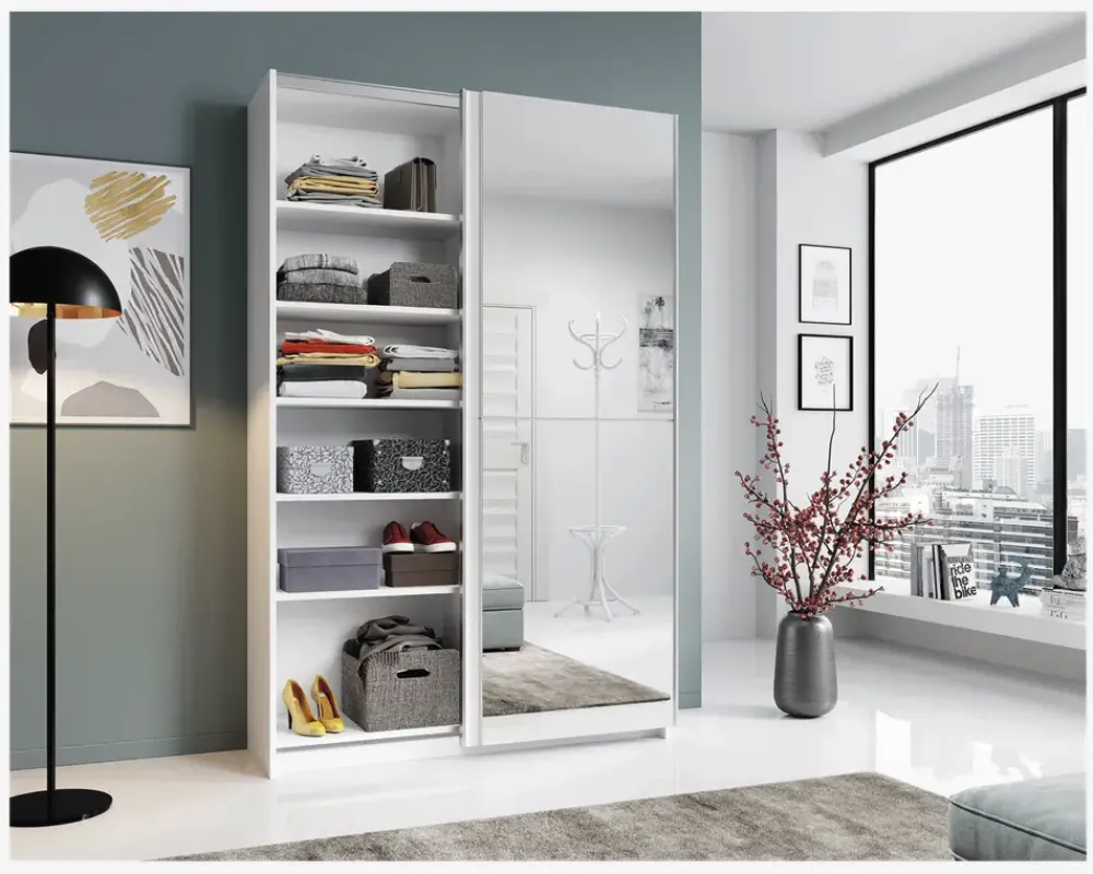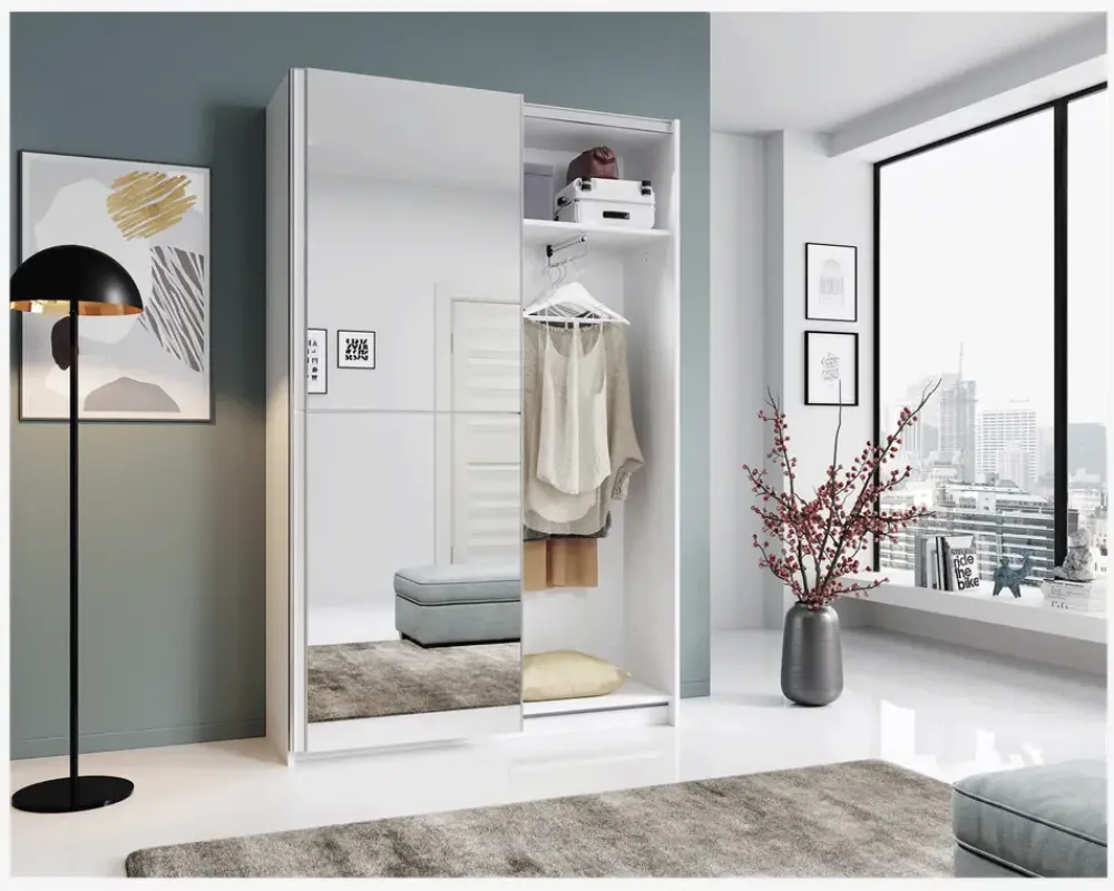 Et lille garderobeskab til værelset hvor pladsen er trang, men behovet for opbevaring af tøj er stort. Garderobeskabet har 2 skydedøre en i hvid kunstfiner, og en i spejl. Skabet er opdelt i 2 lige store rum, den ene side indeholder 1 hylde og udtræksbøjlestang, mens den anden side indeholder i alt 5 hylder. Garderobeskabet fås som her i hvid kunstfiner, men du kan også vælge det i eg kunstfiner, eller uden spejllåge, hvis det passer bedre ind i dit soveværelse. Skabets dybde på kun 38 cm, gør det særdeles velegnet i det lille børneværelse, sommerhuset eller soveværelset som ikke er så stort.Garderobeskabet er fremstillet med et korpus og døre i hvid kunstfiner. Garderobeskabet kræver ingen vedligeholdelse, og rengøres med en klud vredet op i rent vand, hvis skabet kræver ekstra rengøring kan du uden problemer bruge spejlrens, til at fjerne genstridige mærker med. Garderobeskabet leveres usamlet, og vi anbefaler at I er to til at samle skabet. Skabet måler H.196 x B.125 x D.38 cm, og er derfor også meget velegnet til huse hvor loft højden er lav.• Let kørende skydedøre• Indeholder 6 hylder og 1 udtræksbøjlestang• Der kan ikke tilkøbes ekstra hylder• Mål i cm.: H.196 x B.125 x D.38• Leveres usamlet