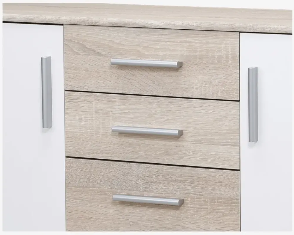 Er du på jagt efter opbevaringsplads til køkkenet eller spisestuen til en billig pris, har du her muligheden for at finde netop det. Skænken giver med sine 4 skuffer og 2 låger meget opbevaringsplads i forhold til prisen, og er derfor meget velegnet til ungdomsboligen, studie eller børneværelset. Skænken kan dog også sagtens bruges i spisestuen eller køkkenet, hvis det er her du mangler pladsen. De 4 skuffer har forskellig højde, hvilket giver dig en fleksibel mulighed for at udnytte pladsen bedst muligt for dig, Skufferne kører på nylonhjul, så du vil opleve en skuffe som er nem at åbne og lukke, selv om du har fyldt dem. Bag hver låge har du en hylde.Skænken er fremstillet i eg kunstfiner, hvid front. Skænken kræver ingen vedligeholdelses og er nem at rengører, med en klud vredet op i rent vand. Skænken leveres usamlet, men hvis du følger den medfølgende samlevejledning, vil du uden problemer kunne samle den.• 4 skuffer, 2 låger og 2 hylder• God til prisen• Mål i cm: H.82 x B.120 x D.35• Leveres usamlet