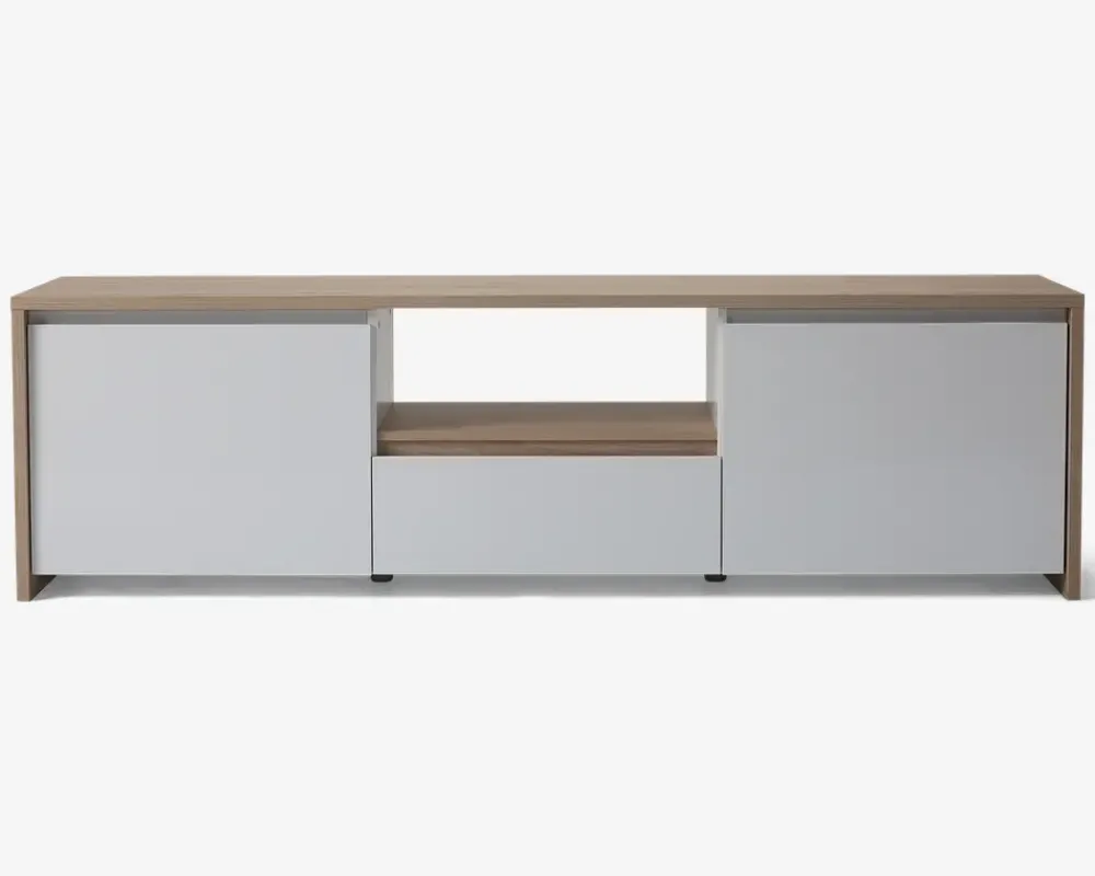 Smart og moderne designet tv-bord med mange flotte detaljer. Tv-bordet har en stor skuffe og 2 store skabe, hvilket giver rigtig meget opbevaringsplads. Ydermere har tv-bordet en stor hylde. Tv-bordet er fremstillet i eg kunstfiner, med fronter i hvid højglans, som er meget rengøringsvenligt. Tør blot af med en hårdt opvredet klud. Mere behøver man ikke. Ingen ekstra vedligeholdelse er nødvendig. Tv-bordet leveres usamlet, men samles nemt. • Smart og moderne tv-bord• Stor skuffe og 2 store skabe• Hvid højglans fronter• Meget rengøringsvenligt.• Leveres usamlet, men samles nemt• Mål i cm. L.179 x H.52 x D.48