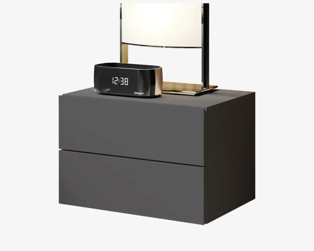 Moderne væghængt sengebord med 2 skuffer. Et vægtsengebord letter både rengøringen, og giver en let indretning af soveværelset, uden at du går på kompromis med opbevaringspladsen til bøger, brille eller lignende som er rare at havde inden for rækkevidde når du er gået i seng.Sengebordet er fremstillet i grafitgrå kunstfiner, og de 2 skuffer kører nemt i metaludtrækket, som også sikre at skufferne ikke kan trækkes for langt ud.Sengebordet kræver ingen vedligeholdelse, rengøringen foretages med en klud vredet op i rent vand.• 2 skuffer• Metaludtræk• Stop • Mål i cm. H. x B. x D.: 28 x 42 x 30• Leveres usamlet