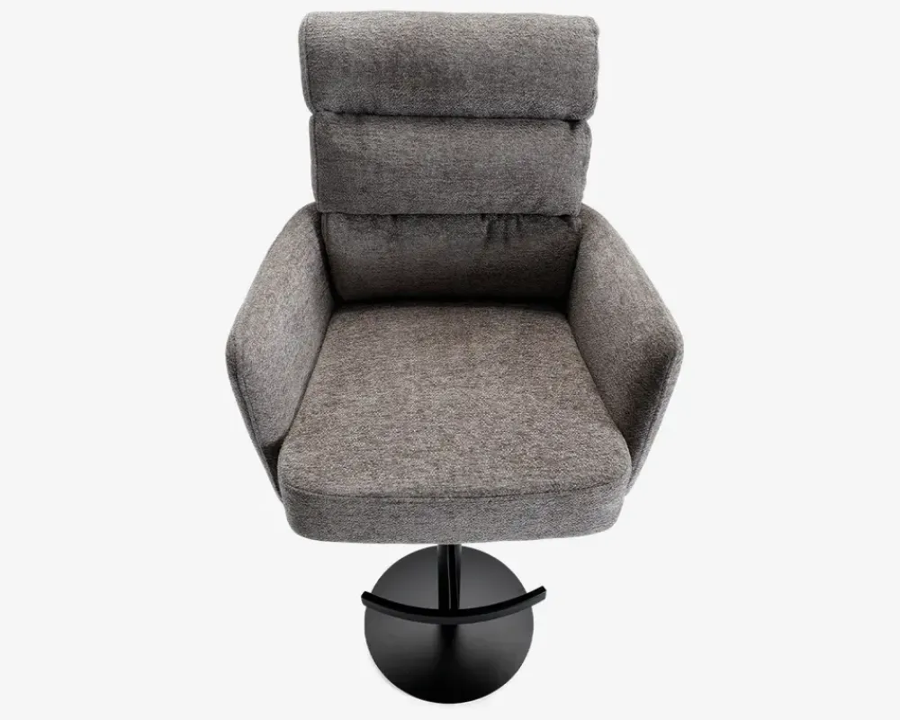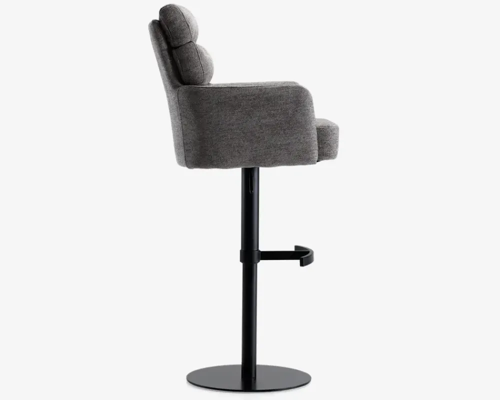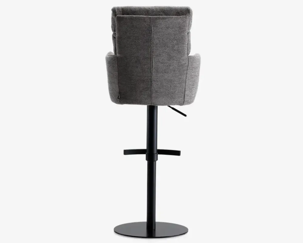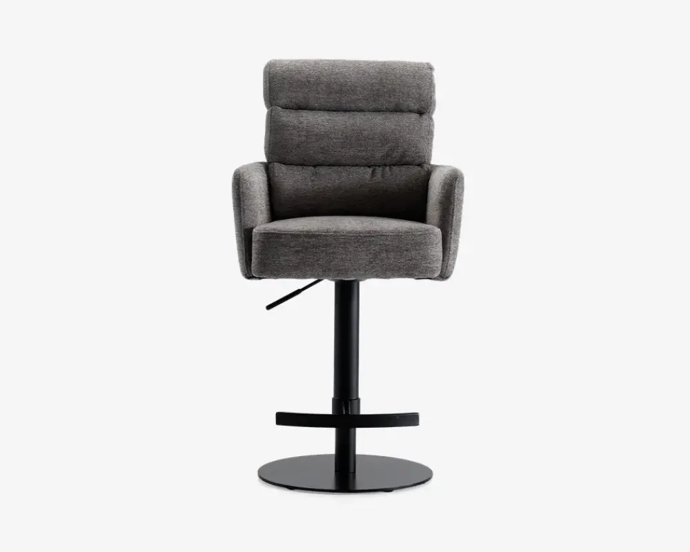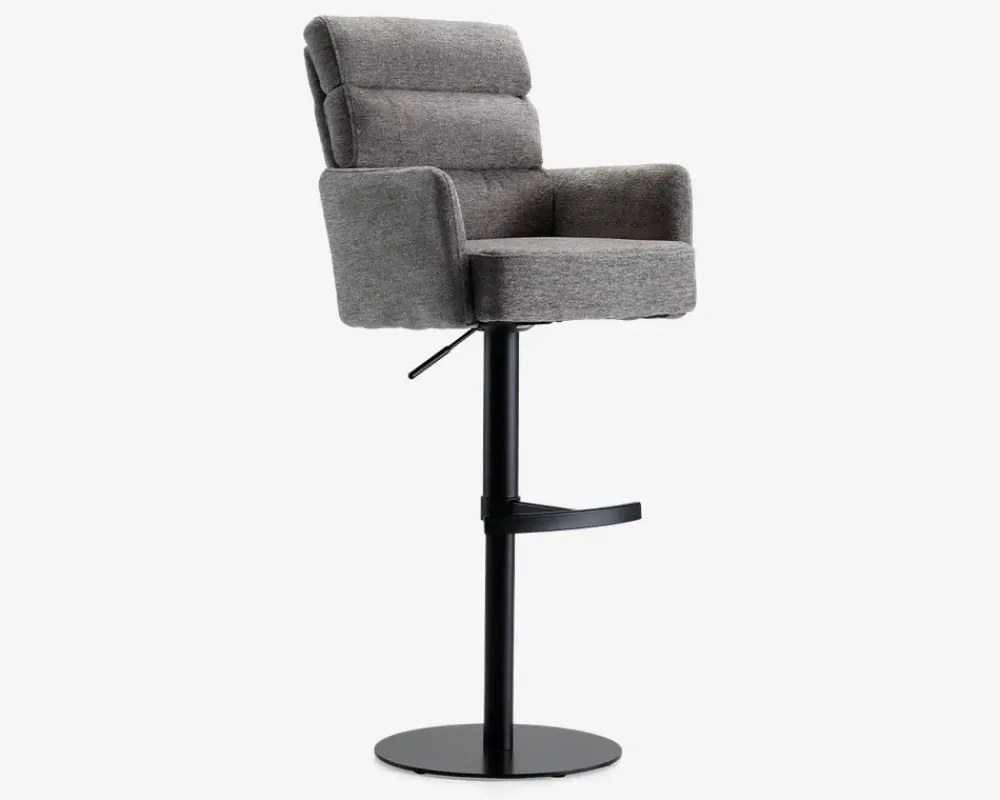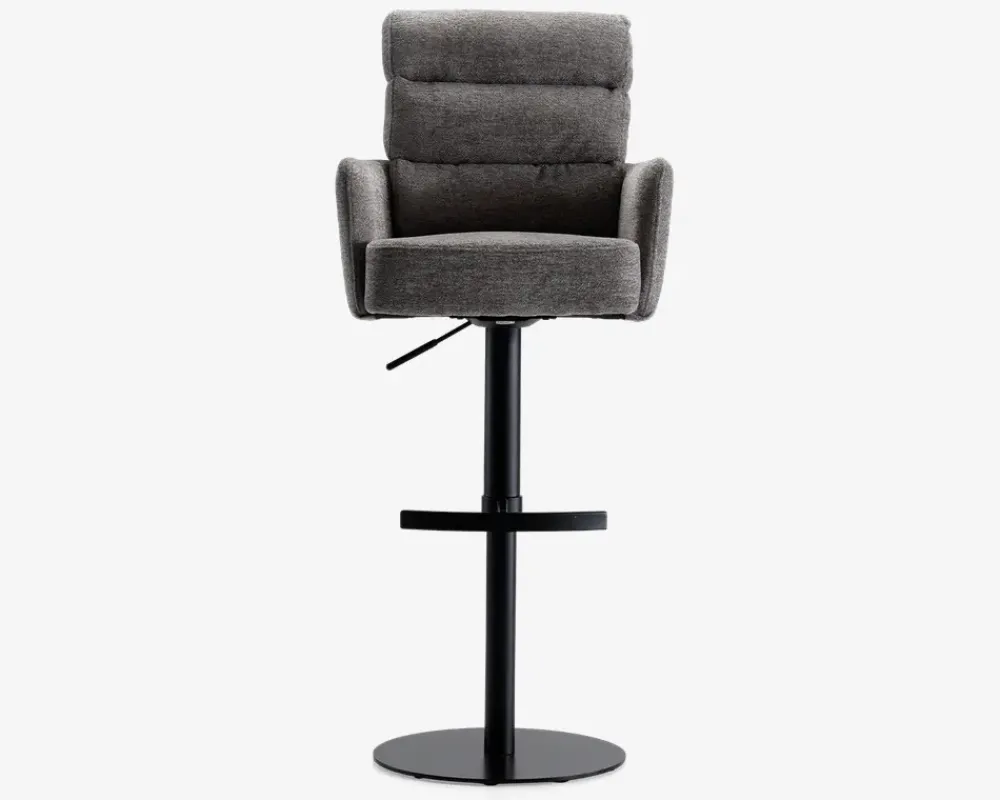 Denne barstol er en del af vores Daells Collection. Daells Collection er en serie af møbler som vi er specielt stolte af at kunne præsenterer. De udmærker sig ved at være en fremragende kvalitet, flot design og gode til prisen.Barstolen her er med armlæn, og stellet har 360° rotation og fodstøtte. I sædet er barstolen fremstillet med posefjedre, som giver en helt fantastisk siddekomfort, som understøttes af den bløde polsteret ryg. Stoffet er et kraftigt møbelstof som findes i 2 farver, beige og grå. Barstolen kræver ingen vedligeholdelse, og samles nemt med 4 skruer. Sædehæjde kan justeres fra 61-87 cm