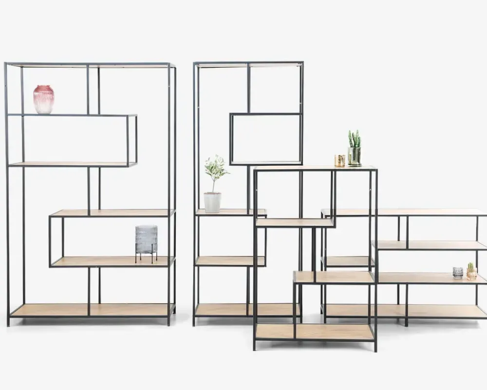 Fritstående reol i sort lakeret metal med hylder i vild eg farvet kunstfiner. Hylderne er placeret asymmetrisk, som i sig selv er meget skulpturelt. Det giver reolen en meget dekorativt udseende og giver et flot og anderledes look. Reolen kan selvfølgelig også stilles langs en væg.I denne serie kan der fås mange forskellige møbler, som gør det muligt at møblere de fleste rum i hjemmet med lige netop denne serie. Serien består af meget ”lette” møbler som kan give et enkelt og flot udtryk overalt i hjemmet. Flere typer sofaborde, tv-borde, reoler, serveringsvogne, skriveborde. Med denne serie er det nemt at indrette sig hyggeligt og praktisk på samme tid.• Fritstående reol.• Sortlakeret metalstel• Hylder i lys vild eg farvet kunstfiner• Dekorativt udseende• Leveres usamlet, men samles nemt• Mål i cm. B.114 x D.35 x H.78