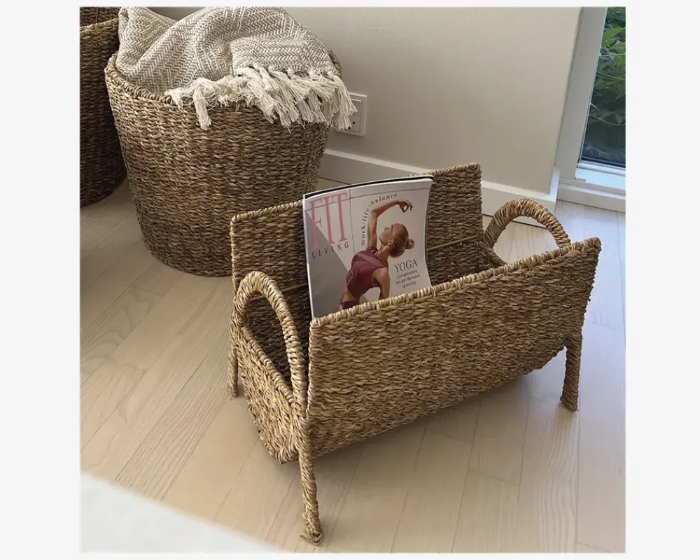 Hold styr på dine magasiner og aviser med denne smukke magasinholder i søgræs. Det naturlige materiale tilføjer et varmt og organisk udtryk til hjemmet, mens det flettede design giver et stilfuldt look. Magasinholderen er både praktisk og dekorativ og kan placeres flere steder i hjemmet. Perfekt til dig, der ønsker en funktionel opbevaringsløsning med et naturligt touch.