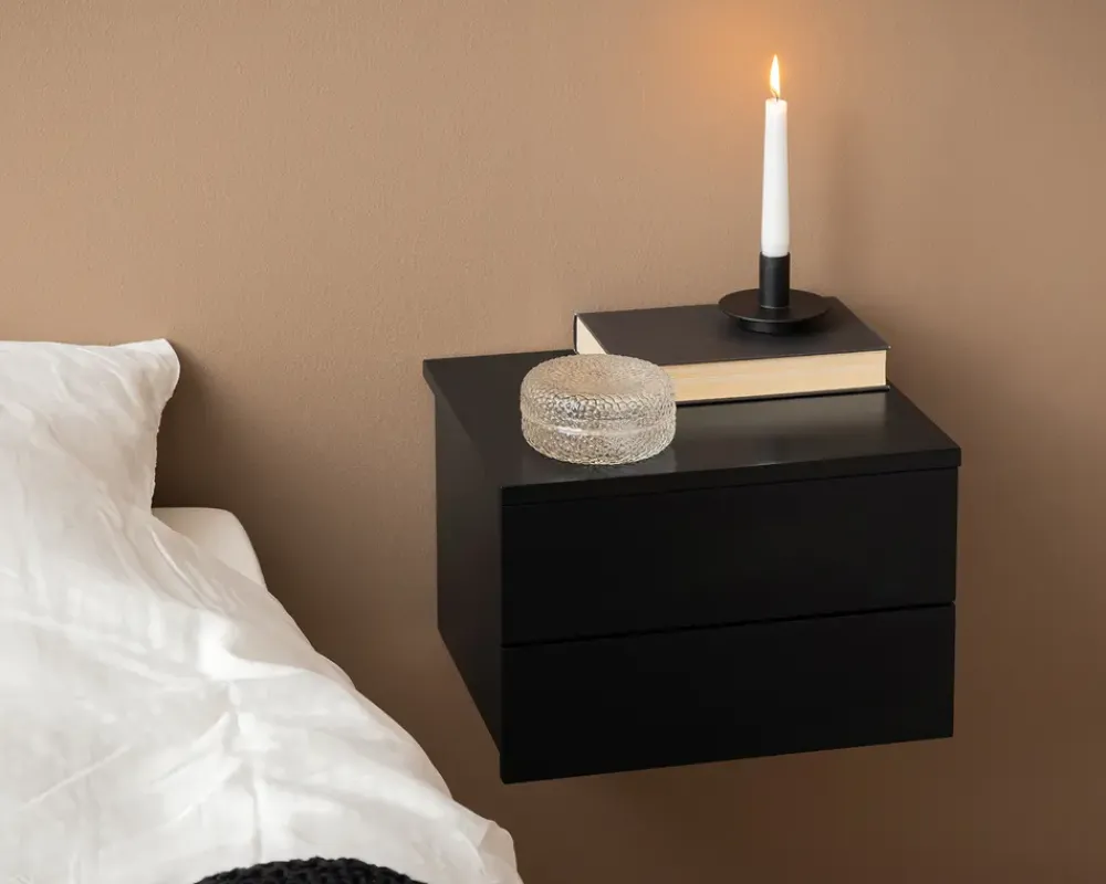 Et væghængt senge bord som dette, er perfekt, det letter rengøringen, hvilket er praktisk i et soveværelse. Sengebordet har et minimalistisk design, med rene linier, og passer derfor diskret ind i de fleste soveværelser. De 2 skuffer giver dig mulighed for at opbevare alt, fra godnat læsningen, briller, medicin, du bestemmer helt selv.Sengebordet er fremstillet i sort lakeret MDF, og kræver ingen vedligeholdelse, rengøringen foretages med en klud vredet op i rent vand. Bemærk at overfladen kan ridses, så hvis du vælger at placere en natlampe på bordet, anbefaler vi at du benytter filtdupper.Leveres usamlet