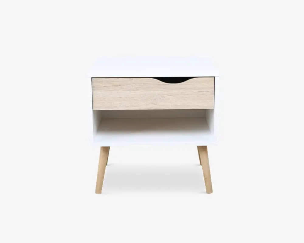 Et sengebord der er fremstillet i hvid med en skuffe i ege kunstfiner.Sengebordets lette og moderne design gør det velegnet sammen med en lang række forskellige senge. Skuffen er god til opbevaring af ting du ikke ønsker skal ligge fremme, mens hylden kan holde styr på bøger, briller eller hvad du ønsker.Sengebordet er en del af en stor serie af møbler, som har et moderne og smart udtryk, serien er fremstillet i rengøringsvenlige materialer, og kan både som enkelt møbel og som serie stå som et frisk pust til indretningen. Se hele det store udvalg af Delta møbler her eller i en af vores møbelhuse.• 1 skuffe og 1 hylde• Let design• Mål i cm: H.50 x B.50 x D.39• Leveres usamlet, men samles let