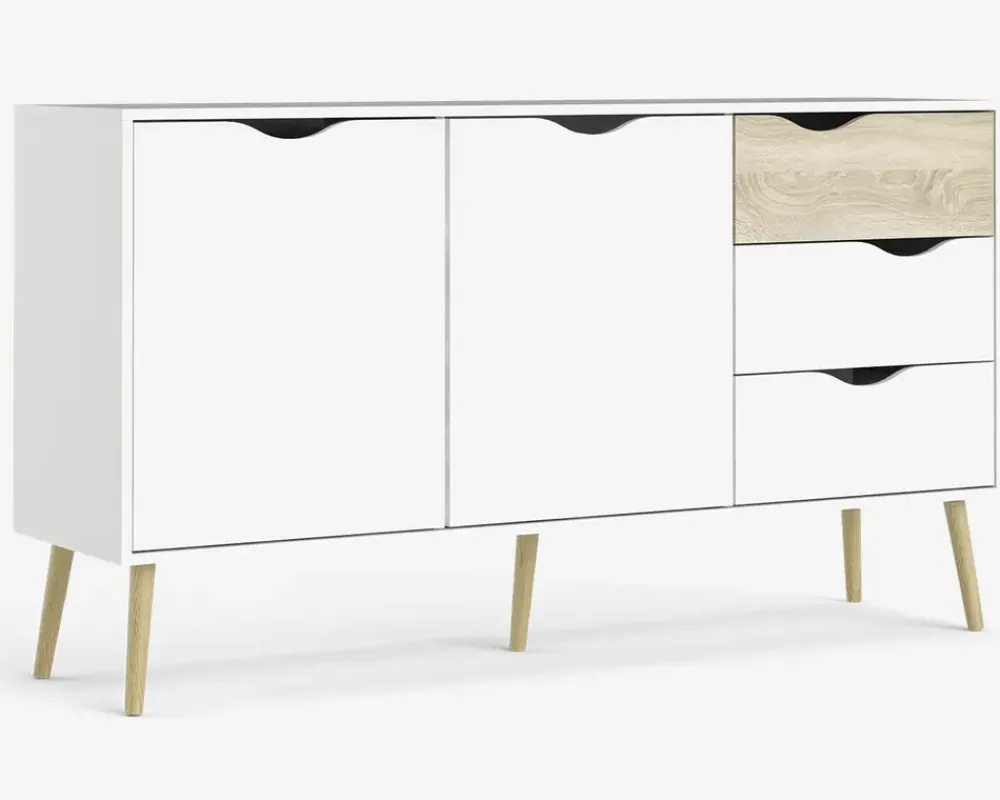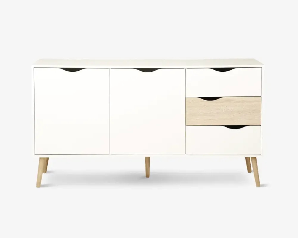 Denne smarte skænk i hvid/eg kunstfiner giver masser af plads til opbevaring i enten spisestuen eller køkkenet. Farve kombinationen passer perfekt sammen med en masse forskellige spiseborde og stole, og det lette skandinaviske design, vil passe flot ind i mange hjem. Materialerne sikre dig et møbel, som er nemt at rengøre og vedligeholde, kunstfiner tåler alle former for rengøringsmidler, undtaget rengøringsmidler med slibemidler i.Skænken har 2 døre, bag dem er der en løs hylde, samt 3 skuffer. Skænken er nem at samle, og du vil opleve en kvalitet som du kan have glæde af i mange år fremover.• Let og elegant design• Rengøringsvenlige materialer• Mål i cm.: H.82 x B.147 x D.40• Leveres usamlet, men samles nemt