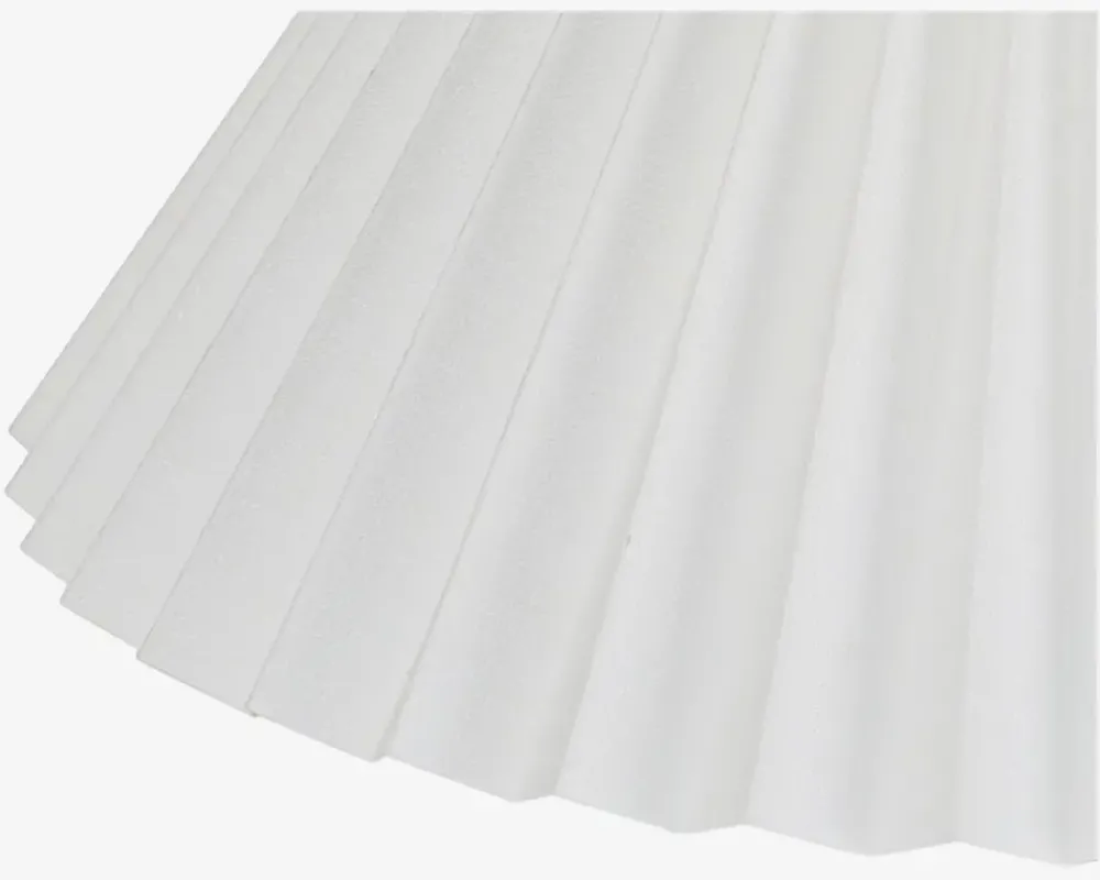 Flot og klassisk plisse lampeskærm af plastik , som passer ind i ethvert hjem, da farven er enkel og neutral. Lampeskærmen er særligt velegnet til en lampefod som kan købes fra sortiment. Lampeskærmen sættes på ved at to metalbøjler inde i lampeskærmen klikkes ned over pæren.