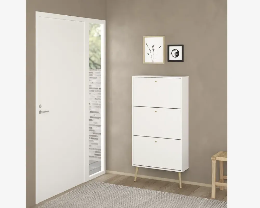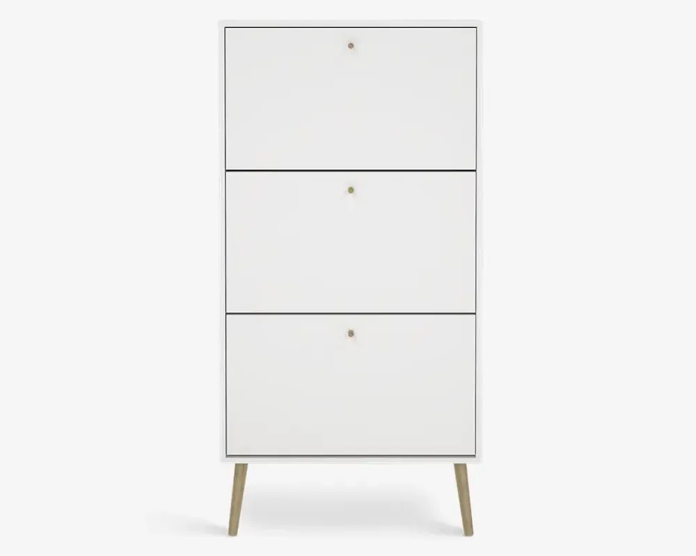 Bodo er en serie som består af en række opbevaringsmøbler, til soveværelset eller spisestuen, men de kan også benyttes i både entreen og bryggers, kort sagt en serie af møbler som hjælper med opbevaringen af ting.Dette skoskab giver plads til op til 18 par sko, i de 3 dobbeltskuffer. Hver skuffe kan bærer op til 5 kg. så du må lige veje sikkerhedsskoene. Hvid du bruger størrelse 44 eller mere, er dette nok ikke det rigtige skoskab til dig.Skoskabet leveres usamlet, men samles uden de store problemer, hvis du følger den vedlagte samlevejledning, du skal sætte et par timer af til at samle skabet, og vi anbefaler at I er 2 når det skal flyttes på plads. Bemærk skoskabet skal fastmonteres til væggen.Skoskabet er fremstillet i hvid kunstfiner med ben i massiv eg. Det kræver ingen vedligeholdelse, og remgøres med en klud vredet op i rent vand..