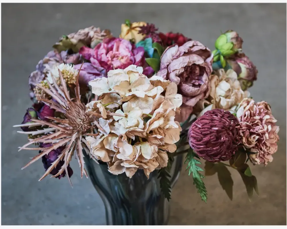 Elegant blomsterstilk med en smuk protea. Stilken er lavet af plastik og måler 42 cm i højden. Den er omhyggeligt udformet for at efterligne den naturlige form af en ægte blomst. Kan bruges enkeltvis eller sammen med andre stilke fra vores sortiment.