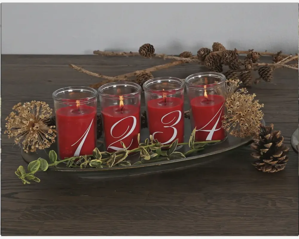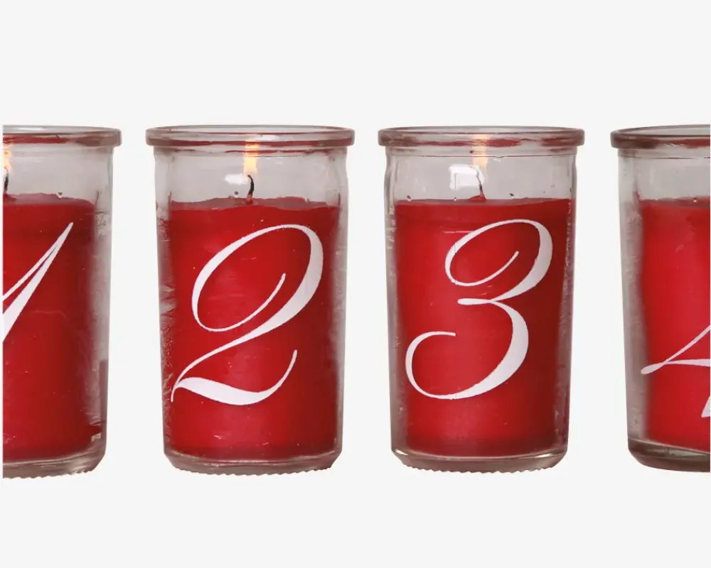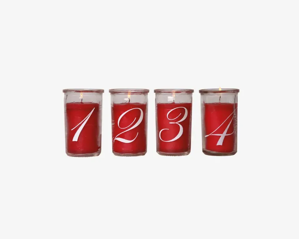 Fine adventslys i rød med tal på. Skab en hyggelig stemning med disse enkle adventslys der kan brænde i ca. 24 timer pr lys.