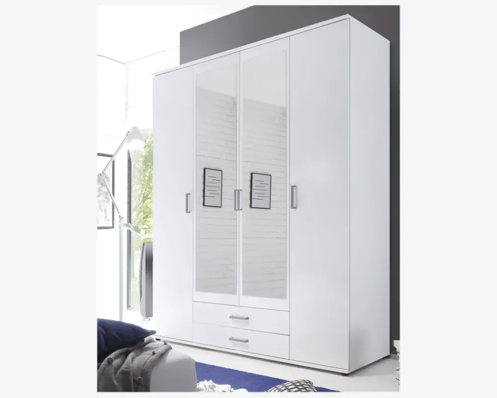 Garderobeskab som er perfekt til den lille lejlighed, børne- eller gæsteværelset. Skabet er fremstillet i hvid kunstfiner, og leveres med to skuffer, to trædøre samt to spejldøre. Garderobeskabet måler B.159 x H.195 x D.55 cm, og leveres usamlet. Garderobeskabet samles uden problemer, hvis du følger den vedlagte samlevejledning. Vi anbefaler altid at I er 2 om at samle skabet, så I undgår skader, både på produktet og på jer selv under samlingen. Vi anbefaler ligeledes at skabet fastmonteres i væggen, det vil både gøre skabet stabilt, og samtidig være en forebyggelse mod at skabet vælter, hvis der bliver kravlet op på skabets hylder.Skabet er færdigindrettet, og der kan ikke tilkøbes yderligere hylder. Bag de to spejldøre i midten indeholder skabet en hylde samt en bøjlestang, og bag de 2 høje døre er skabet udstyret med 3 hylder i hver side, disse kan justeres lidt i højden. Skabet giver med sin indretning plads både til bøjletøj, tøj som du gerne vil have i skuffe, og endelig tøj som du ønsker at opbevare på hylder.• 7 hylder• 1 Bøjlestang• Mål i cm H. x B. x D.: 195 x 159 x 55• Findes også i eg kunstfiner• Leveres usamlet