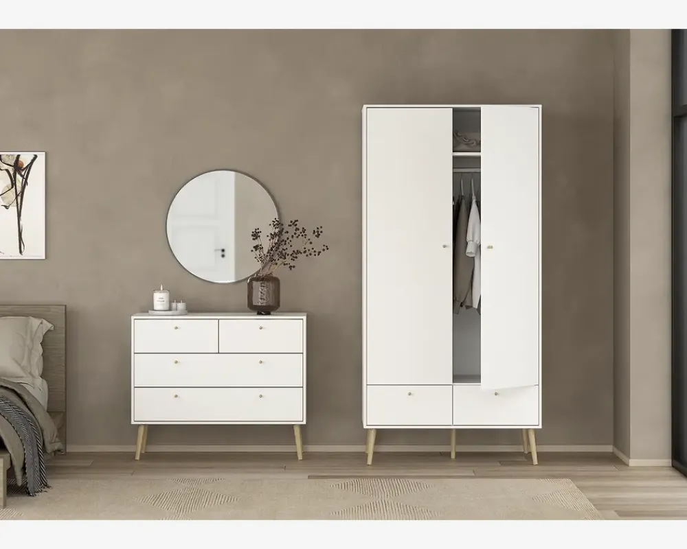 Bodo er en serie som består af en række opbevaringsmøbler, til soveværelset eller spisestuen, men de kan også benyttes i både entreen og bryggers, kort sagt en serie af møbler som hjælper med opbevaringen af ting.Bodo kommoden har 4 skuffer, 2 i fuld bredde og 2 i halv bredde. Det giver dig god mulighed for at sorterer tøjet som du ønsker, og både de bredde og de smalle skuffer rummer godt. De bredde skuffer kan bære 9 kg. pr. stk. mens de smalle kan bære 6 kg. pr. stk. Så selv om skuffen rummer godt, er det ikke til håndvægtene.Kommoden er fremstillet i hvid kunstfiner med ben i massiv eg. Den leveres usamlet, men samles uden de store problemer hvis du følger den vedlagte samlevejledning. Vi anbefaler at I er to når kommoden skal samles og flyttes på plads. Du skal forvente at det tager omkring 3 timer, før du kan se det færdige resultat.Kommode kræver ingen vedligeholdelse, og rengøres med en klud vredet op i rent vand.