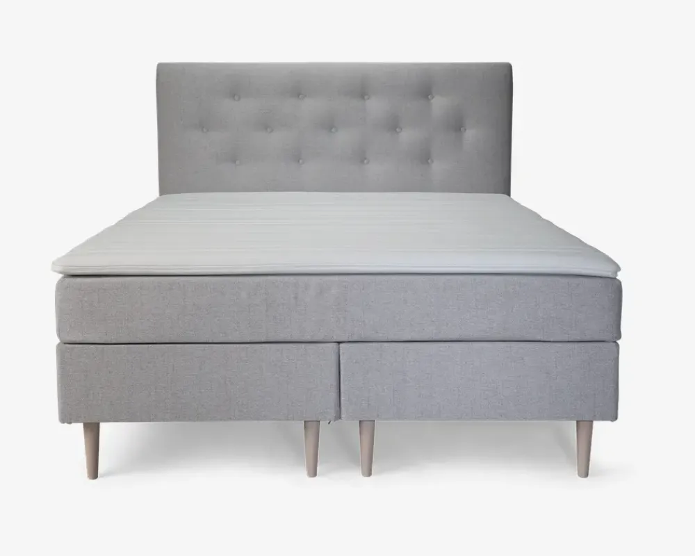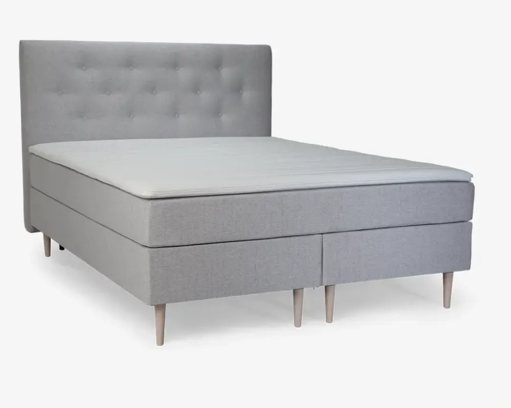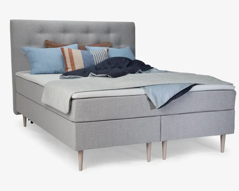 Komplet kontinentalseng i 180 x 200 cm, inkl. gavl, topmadras og bensæt. Sengen består af 2 sæt ben i natur træ, 2 baser i spånplade, 1 stk. 5-zonet springmadras med 220 posefjedre pr m², 1 betræk til springmadras i 180×200 cm, 1 stor topmadras i 30 mm polyetherskum, med aftageligt betræk som kan vaskes ved 30°. Derudover medfølger en hovedgavl som placeres på gulvet op mod væggen , kort sagt en komplet seng klar til brug, når du har samlet den. Sengen vil med den grå farve passe ind i mange danske hjem, og de neutrale farve, gør det nemt at få den trukket ind i netop din stil.De 220 posefjedre pr. m² er inddelt i 5 komfortzoner, og de vil give dig en rolig søvn, og reducerer dit behov for at vende dig, så du vil vågne frisk og veludhvilet hver morgen. For at holde madrassen frisk og sikre at I hele tiden får optimal støtte til kroppen, anbefaler vi at I med jævne mellemrum vender selve springmadrasserne, på den måde vil I både opleve en bedre støtte, og holdbarheden vil forlænges markant. Det samme gør sig gældende for topmadrassen.Sengen kræver ingen vedligeholdelse, og holdes ren med en støvsuger, samt en klud vredet op i rent vand. Betrækket på topmadrassen kan afmonteres og vaskes i vaskemaskinen ved 30°. Efter vask bør betrækket monteres igen mens det stadig er en smule fugtigt, på den måde vil det strække sig igen.• Inkl. 2 bensæt, hovedgavl, 2 baser, 2 springmadrasser, betræk til springmadrasser samt 1 topmadras• Medium hårdhed• 5-zonet springmadras med 220 posefjedre pr. m²• Madrasmål i cm.: 180 x 200• Totalmål i cm.: H. 113 x B. 184 x L. 210• Leveres usamlet