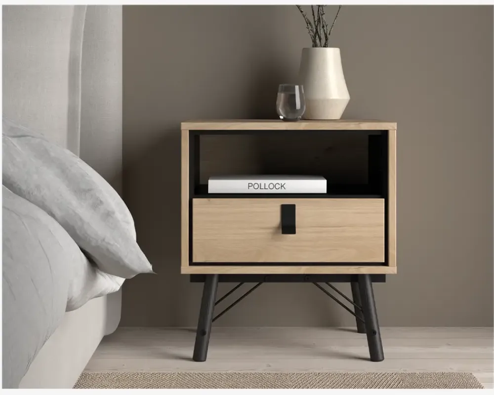 Ry er en serie af møbler som er fremstillet til spisestuen og soveværelset. Serien er fremstillet i et moderne design, som kan kombineres med en lang række af vores spiseborde og senge. Serien findes i 2 forskellige farvekombinationer sort/valnød eller i eg. De forskellige møbler er fremstillet i kunstfiner, som dels ikke kræver nogen vedligeholdelse, og samtidig er utrolig rengøringsvenlige. Alt du skal gøre er at vride en klud op i rent vand, og tørre møblet af. Skulle du opleve at du står overfor lidt mere genstridige mærker, kan disse fjernes med en smule husholdningssprit på en klud. Serien leveres usamlet, men hvis du blot holder dig til den medfølgende samlevejledning er møblet enkelt at samle. Du bør sætte lidt tid af, da der er mange løsdele. Dette sengebord i eg kunstfiner indeholder 1 skuffe og 1 hylde. Sengebordet giver derfor en smule opbevaring til bøger, briller eller hvad du ellers har brug for at gemme af vejen, for at holde orden.• Eg kunstfiner• Rengøringsvenlig• Findes i andre udgaver• Mål i cm.: H.59,6 x B.53,3 x D.40,1• Leveres usamlet
