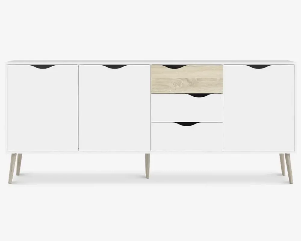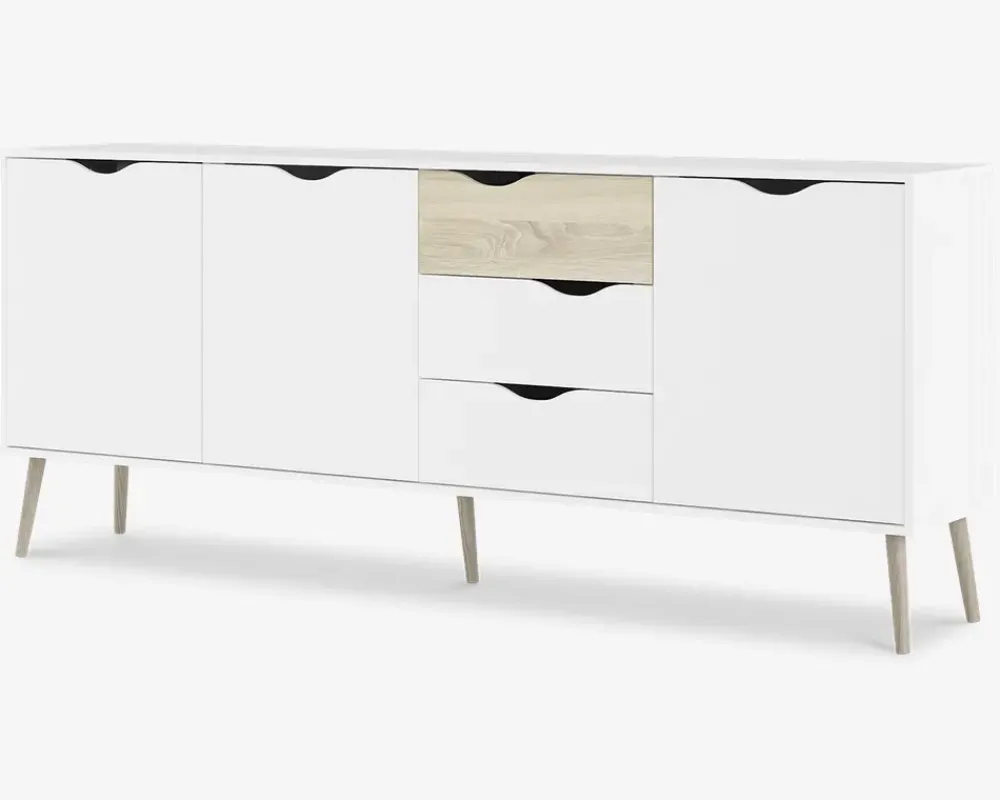 Denne store skænk i hvid/eg kunstfiner giver masser af plads til opbevaring i enten spisestuen eller køkkenet. Farve kombinationen passer perfekt sammen med en masse forskellige spiseborde og stole, og det lette skandinaviske design, vil passe flot ind i mange hjem. Materialerne sikre dig et møbel, som er nemt at rengøre og vedligeholde, kunstfiner tåler alle former for rengøringsmidler, undtaget rengøringsmidler med slibemidler i.Skænken har 3 døre og 3 skuffer, bag hver låge finder du 1 hylde. Skænken er nem at samle, og du vil opleve en kvalitet som du kan have glæde af i mange år fremover.• 3 døre og 3 skuffer• Let og elegant design• Rengøringsvenlige materialer• Mål i cm.: H.82 x B.196 x D.39• Leveres usamlet, men samles nemt