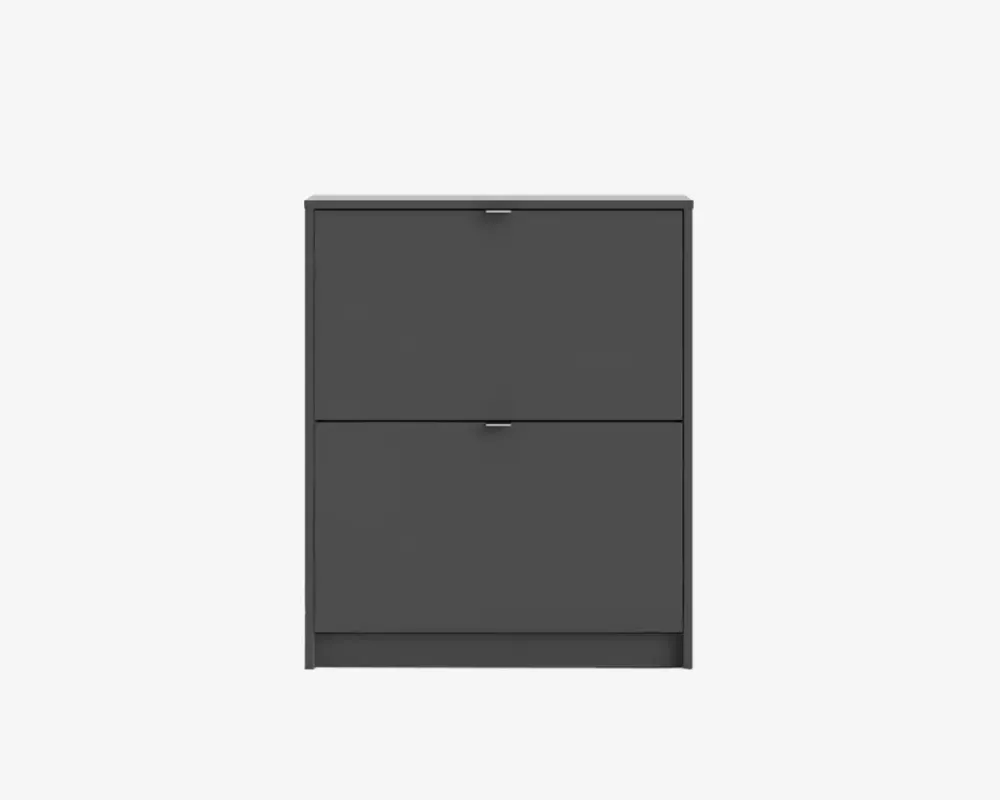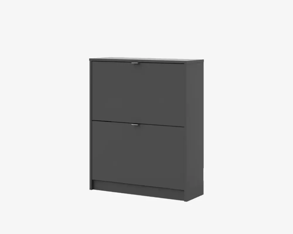 Et flot skoskab med 2 låger, som i alt giver plads til 12 par sko i varierende størrelser. Hver låge har 2 rækker, så hvis du mangler opbevaringsplads til dine sko, har du her muligheden. Skoskabet er en del af en serie bestående af skoskabe i forskellige størrelser, og de findes i flere forskellige farver, dette giver dig god mulighed for at finde en der passer hjem hos dig, uanset om det er størrelsen eller farven du ønsker at passe ind.Skoskabet er fremstillet i gråt kunstfiner, som nemt rengøres, med en klud vredet op i rent vand. Der skal ikke bruges rengøringsmidler, er du uheldig og få et sål mærke på skabet, kan denne fjernes med en lille smule husholdningssprit på en klud. Sten og jord vil ridse skuffen indvendigt. Vi anbefaler grundet den lille dybde på skabet at det fastgøres til væggen, på den måde sikre du at skabet ikke vælter når du åbner den øverste låge. Skabet leveres usamlet, hvis du følger den vedlagte samlevejledning samles det nemt, men det tager lidt tid.• Findes i 3 farver• Findes i 3 højder• Mål i cm.: H.85,2 x B.70,3 x D.24,05• Leveres usamlet