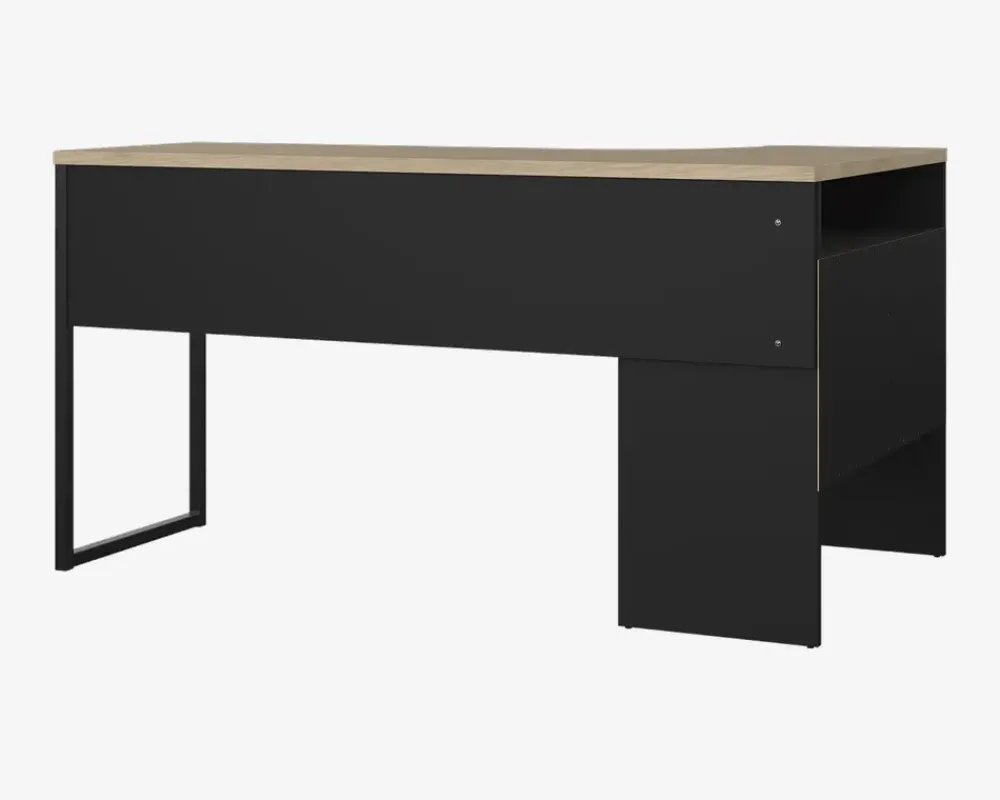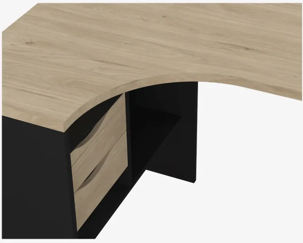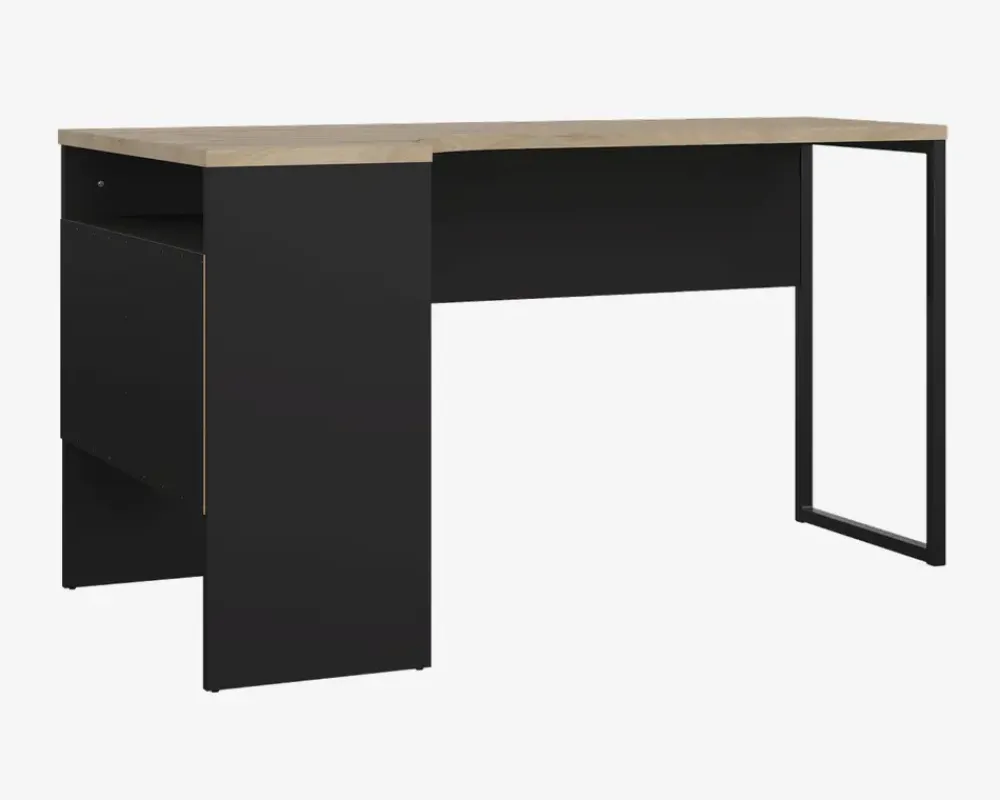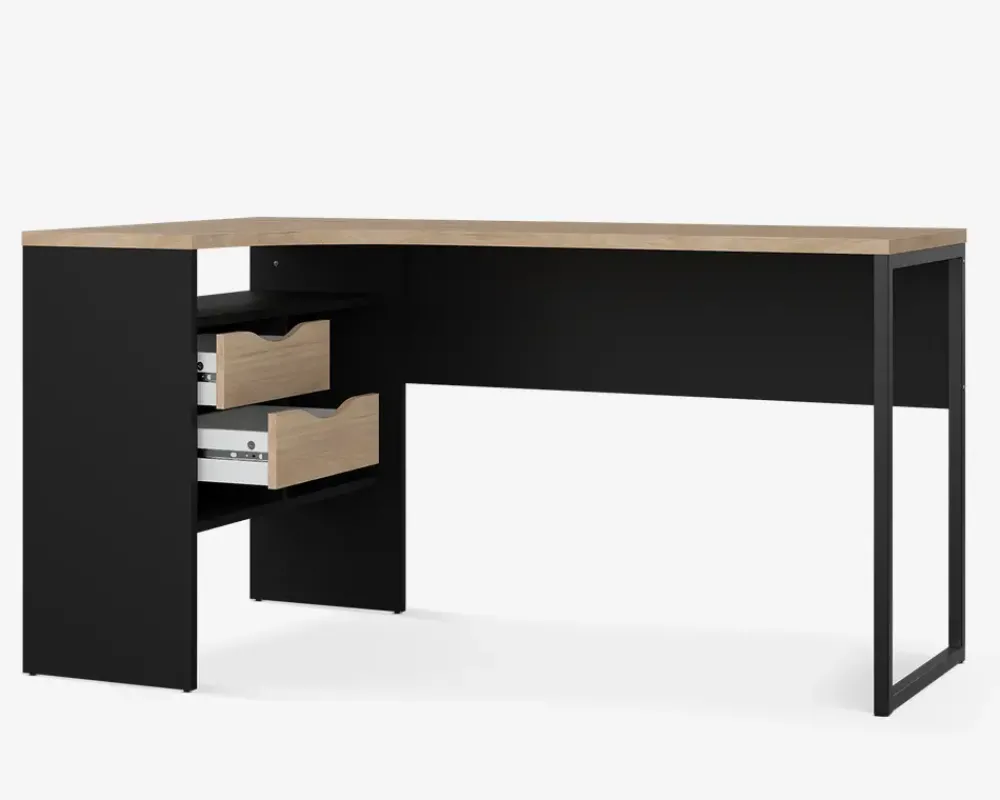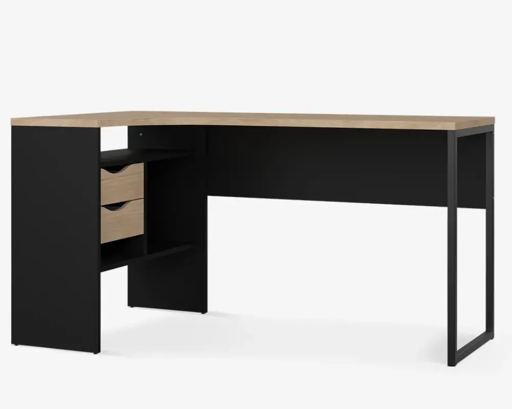 Smart hjørneskrivebord med en meget stor bordplade så der er plads til det hele. Gode opbevaringsmuligheder i skufferne og på reolen som er placeret under bordpladen og på den måde er meget pladsbesparende. Skrivebordet er fremstillet i rengøringsvenlige materialer og den flotte farvekombination gør at det kan passe ind alle steder. Bordet kan kun leveres venstrevendt som vist her.• Sort/lys eg kunstfiner• Pulverlakeret metalstel• 2 gode, store skuffer• Meget pladsbesparende• Meget rengøringsvenlig• Leveres usamlet, men samles let• Mål i cm. B. 145cm. D. 81/49 cm. H. 77 cm.