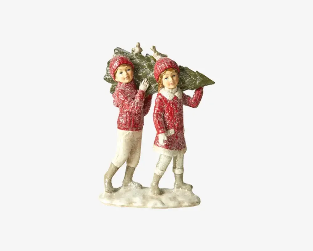 Denne søde julefigur med to vinterbørn, der bærer på et juletræ, er en charmerende dekoration. Med sin højde på 16cm er det den perfekte tilføjelse til din juleudsmykning. Placer denne søde julefigur på dit julebord, på en hylde eller i en vindueskarm. Skab en magisk julestemning i dit hjem med denne rørende julefigur, der hylder vinterens glæder og juleånden med de to elskelige børn og deres juletræ.• Mål i cm: H.16 x L.12 x B.6