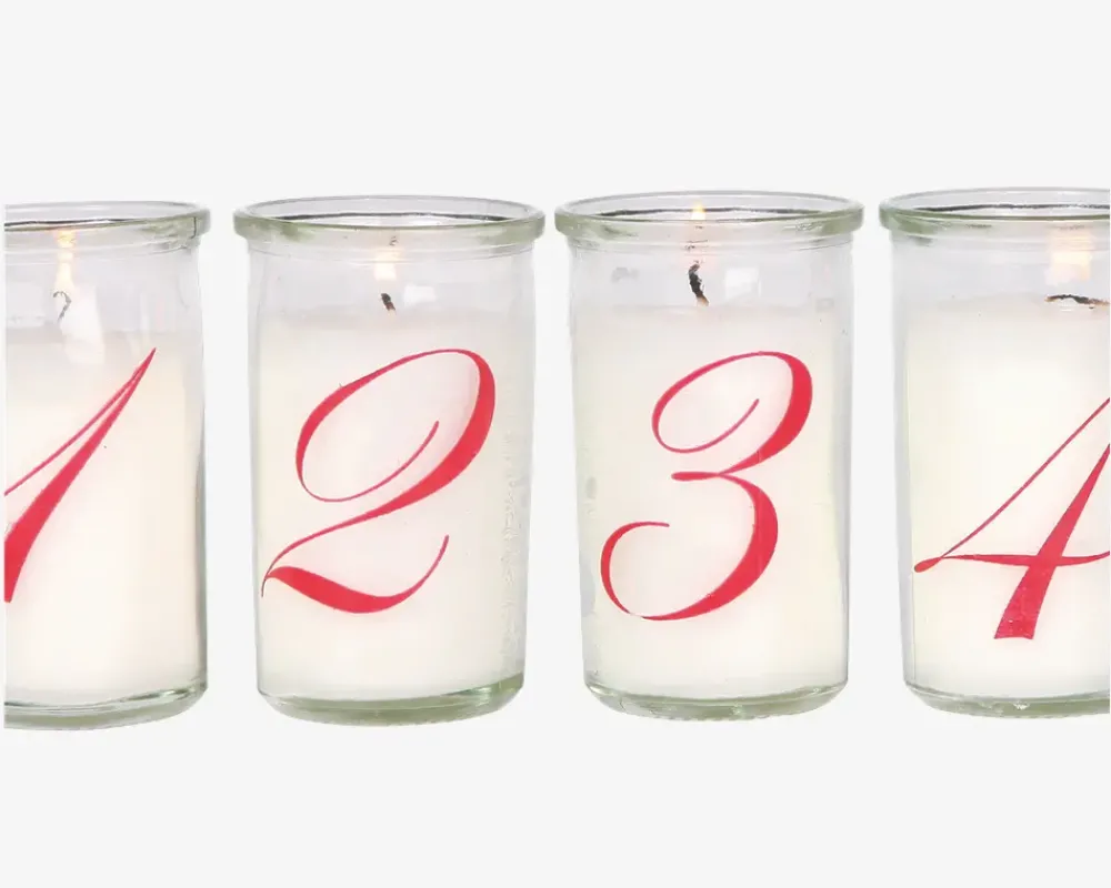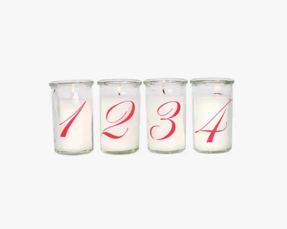 Fine adventslys i hvid med tal på. Skab en hyggelig stemning med disse enkle adventslys der kan brænde i ca. 24 timer pr lys.