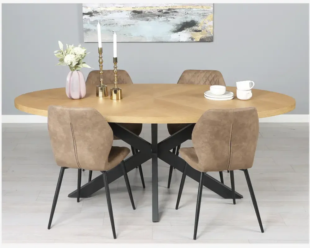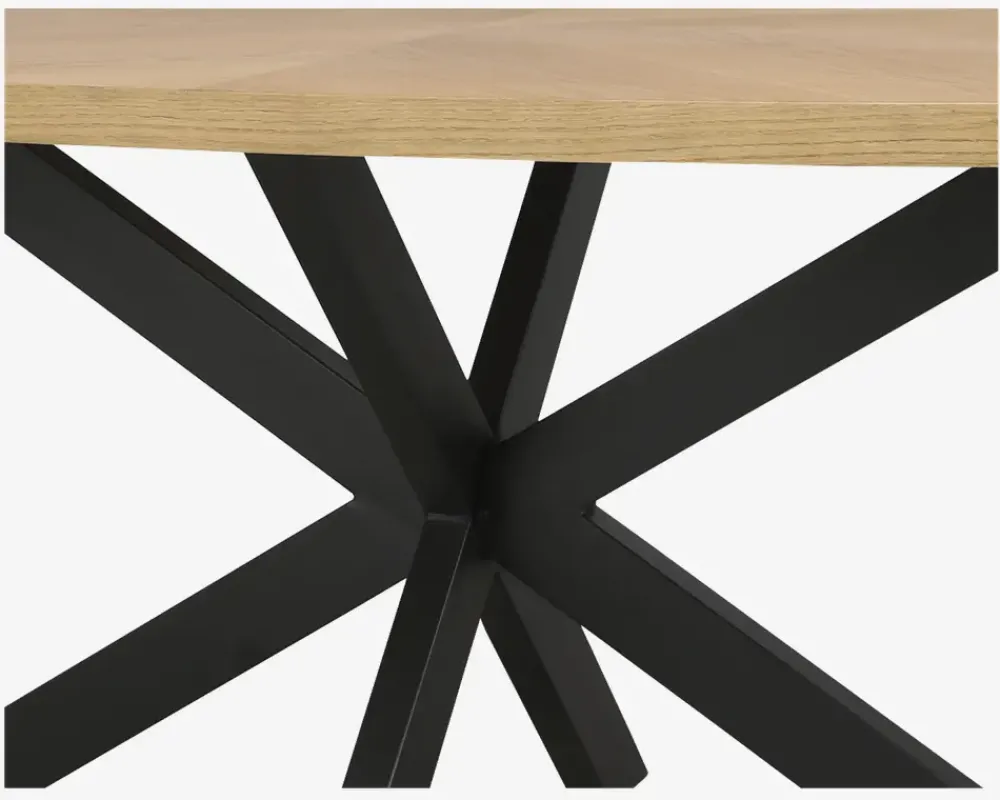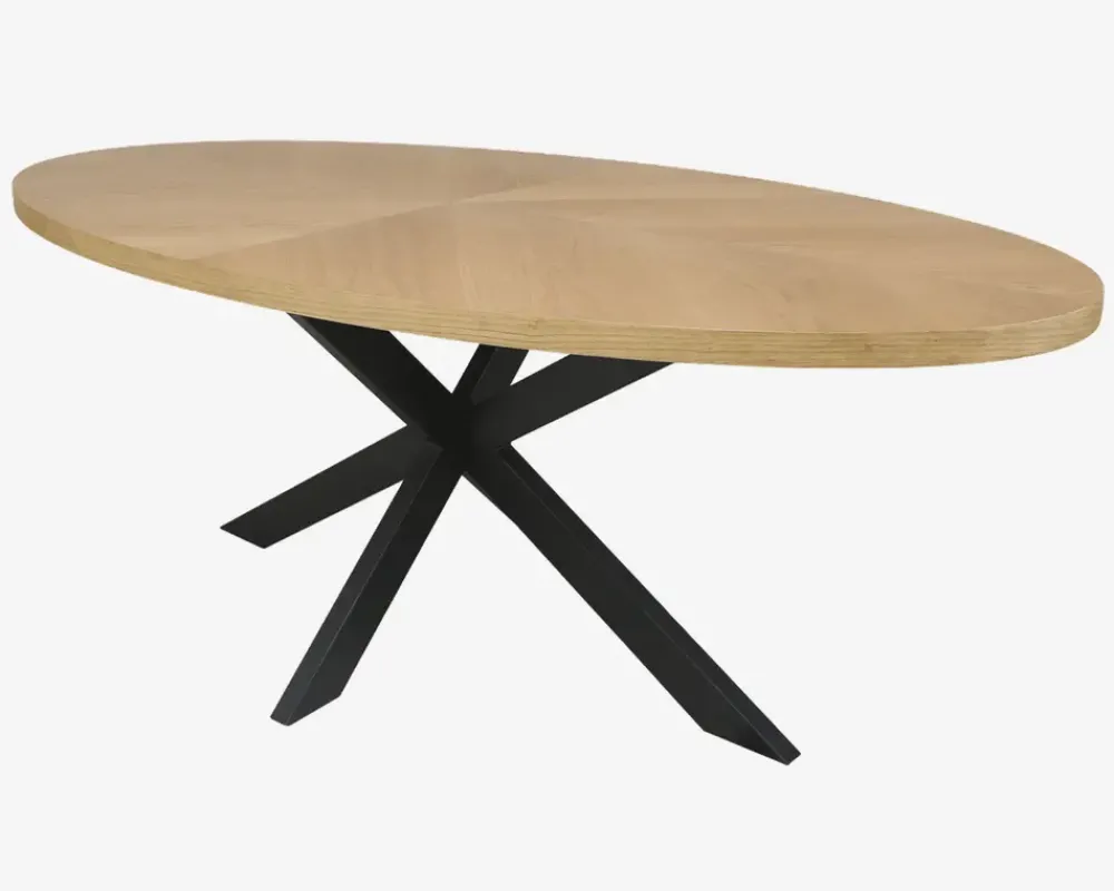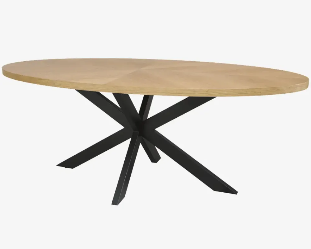 Spisebord i flot oval form, med en kraftig bordplade, og stjernestel i sort pulverlakeret stål. Bordpladen er fremstillet i MDF belagt med ege finer, fineren er på lagt i et flot mønster, som er med til at give bordet unikt look. Stellet er i kraftig sort pulverlakeret stål som giver bordpladen en stabil base, så du virkelig mærker at du har med et robust spisebord at gøre. Dette bord vil stå flot uanset om du placerer det i en spisestue, et køkkenalrum eller mødelokalet.Spisebordet kræver ingen vedligeholdelse, fineren tørres af med en klud vredet op i rent vand, bordet må ikke sjaskes til i vand, ligesom slibende rengøringsmidler ikke må benyttes til overfladen. Det er vigtigt at spildte væsker tørres op hurtigt, da de kan trænge igennem lakken, og ødelægge bordet. Stellet aftørres med en fugtig klud efter behov.Spisebordet leveres usamlet, men samles let ved at følge den medfølgende samlevejledning. Vi anbefaler altid at I er to når spisebordet skal samles, og eller flyttes.